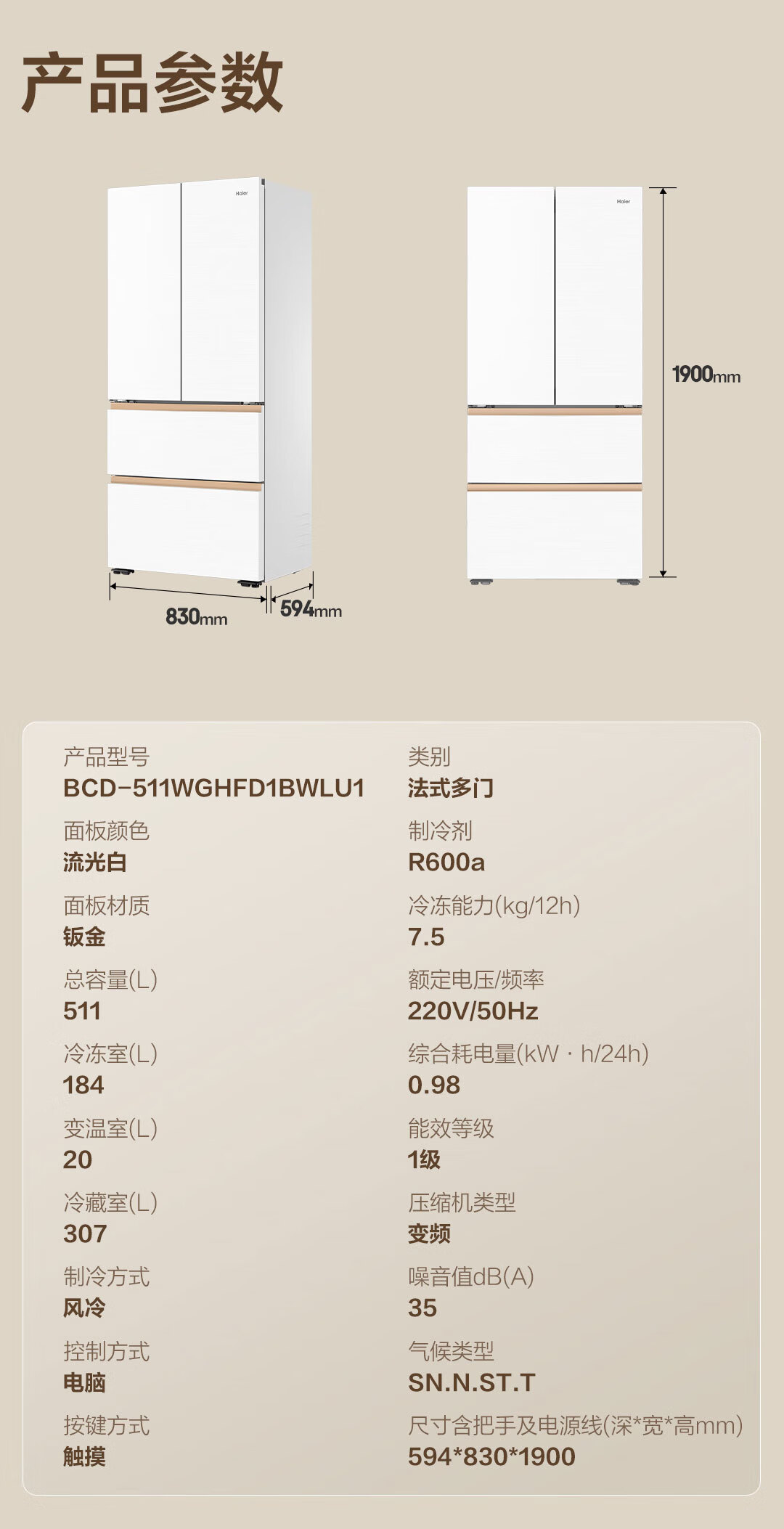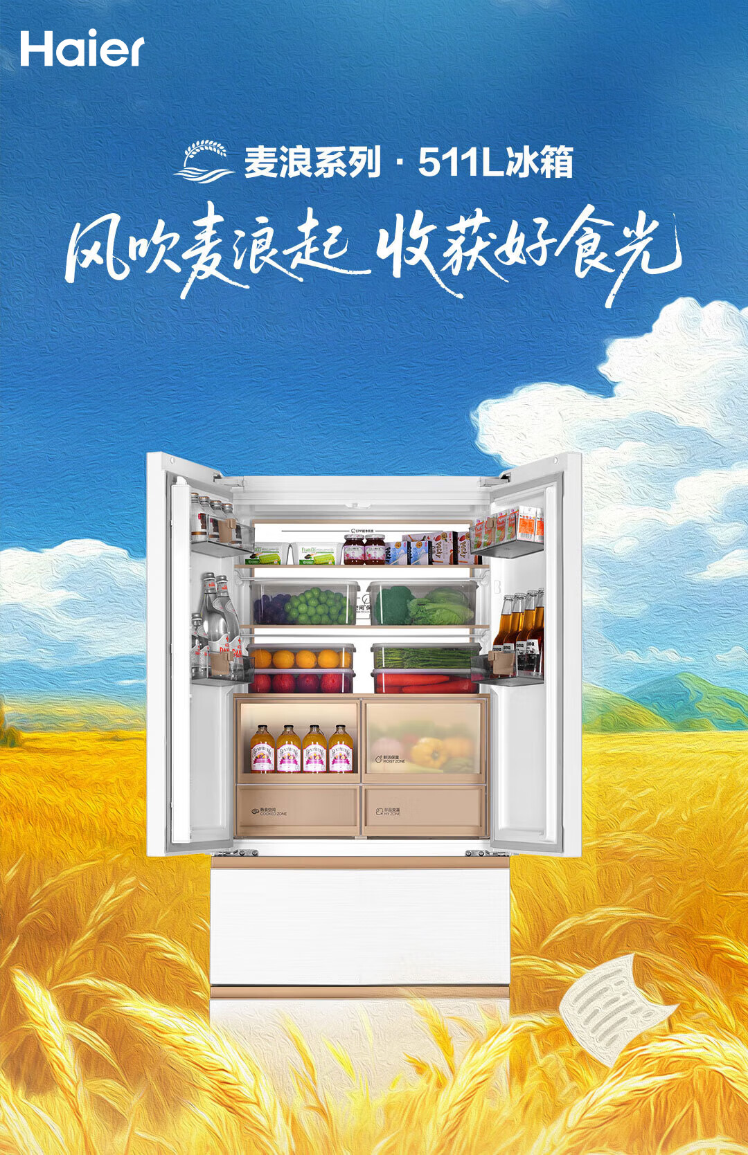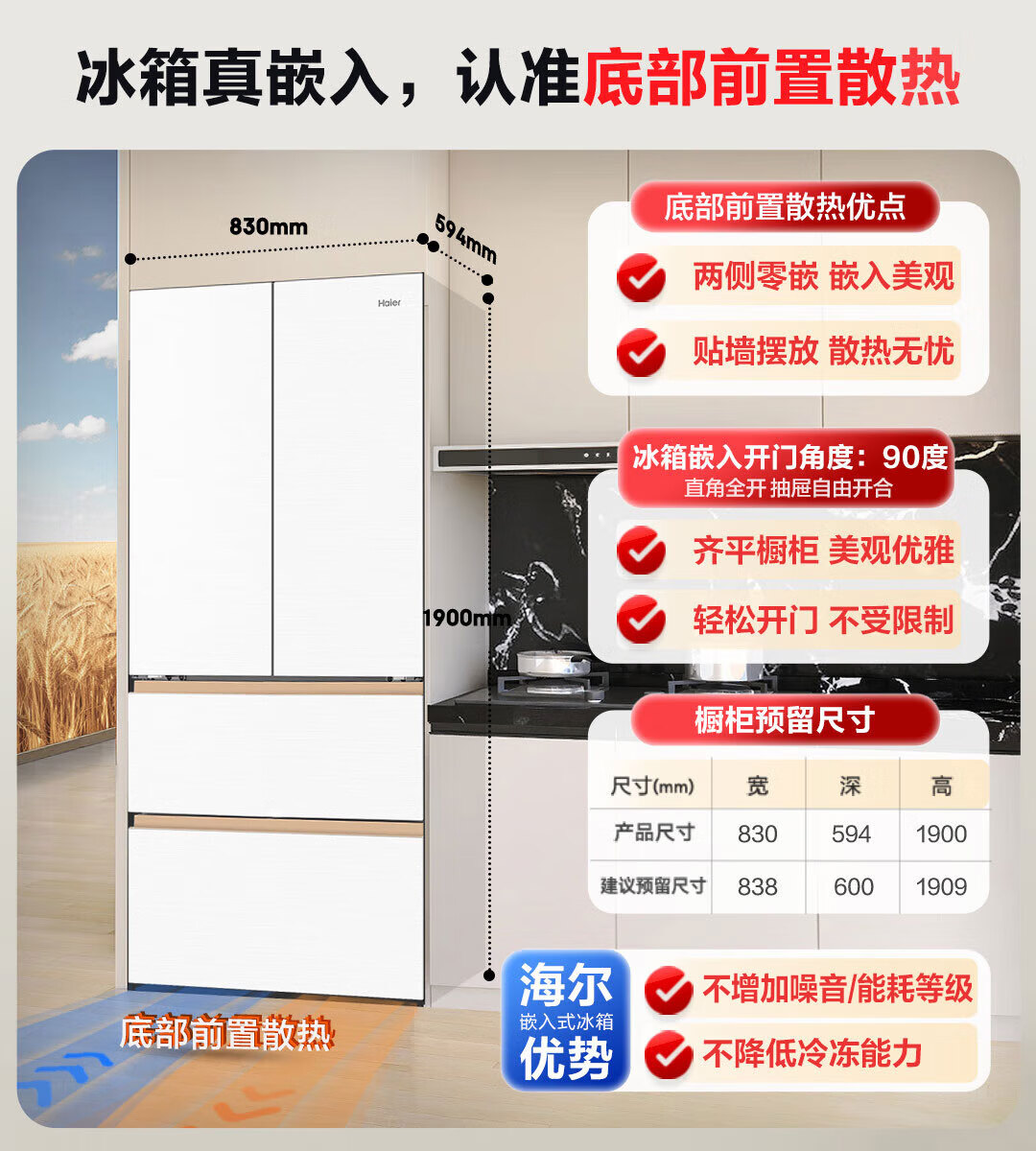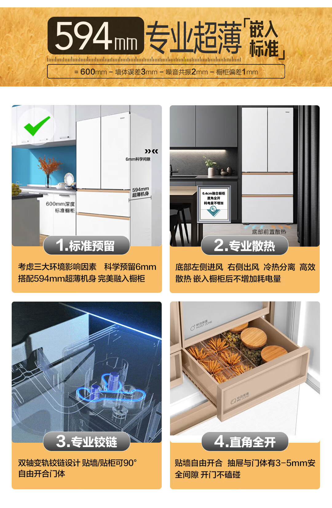 海尔511升麦浪全空间保鲜594mm专业超薄零嵌多门家用电冰箱一级能效国家补贴20%