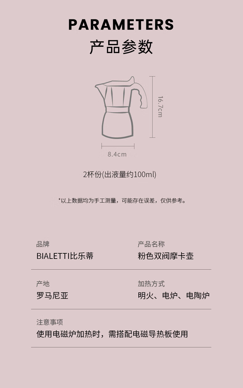 比乐蒂(Bialetti)【新婚礼物】粉色摩卡壶 手冲咖啡壶双阀意式浓缩咖啡机伴手礼 【新品】糖果粉2杯份 100ml