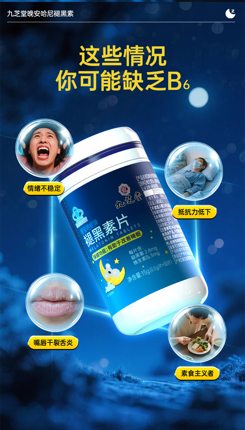 九芝堂褪黑素维生素b6改善睡眠失眠30粒深闪睡退黑素助眠安眠成人男女