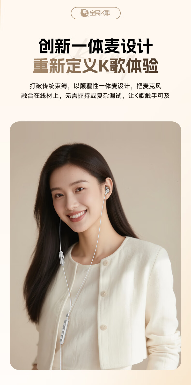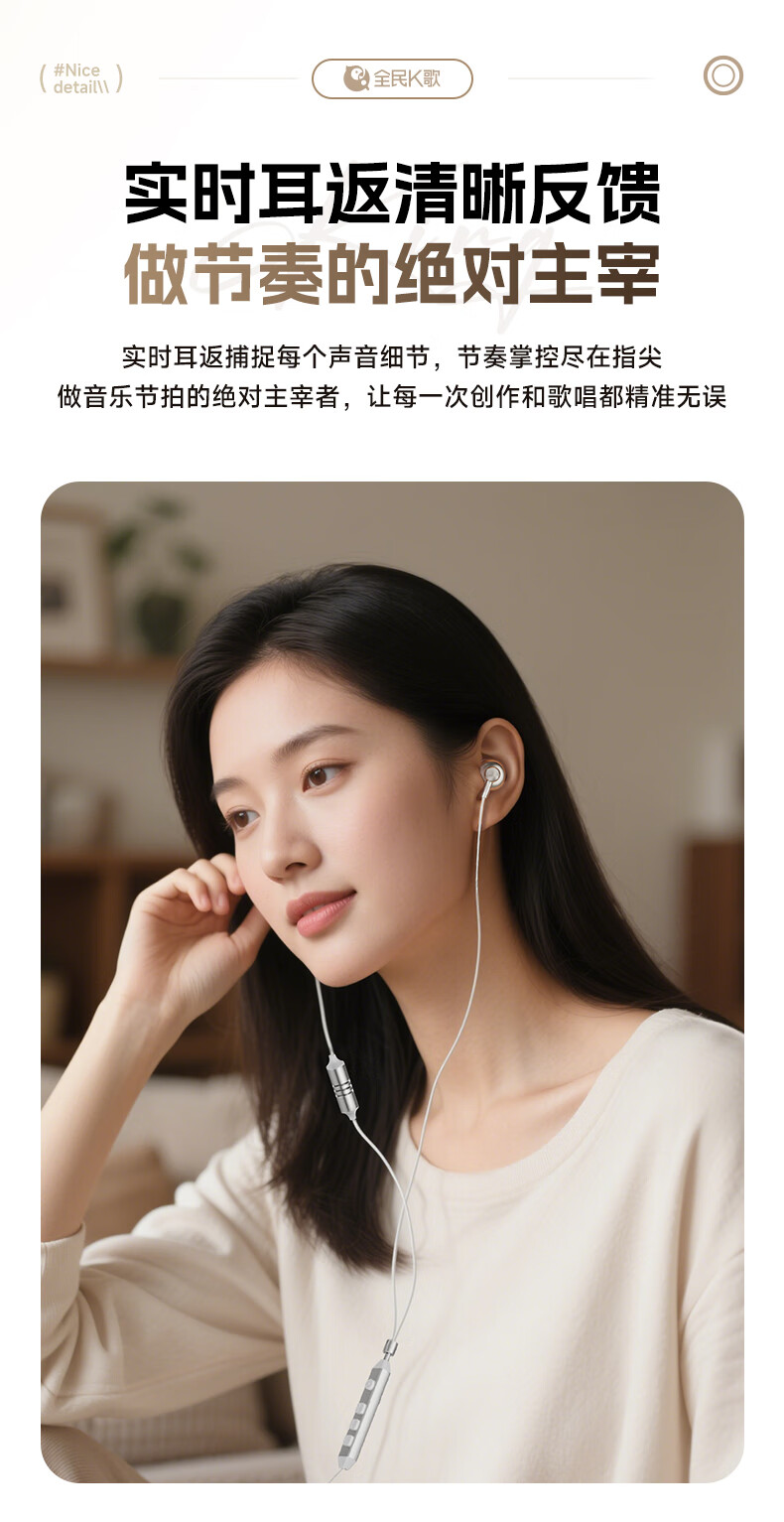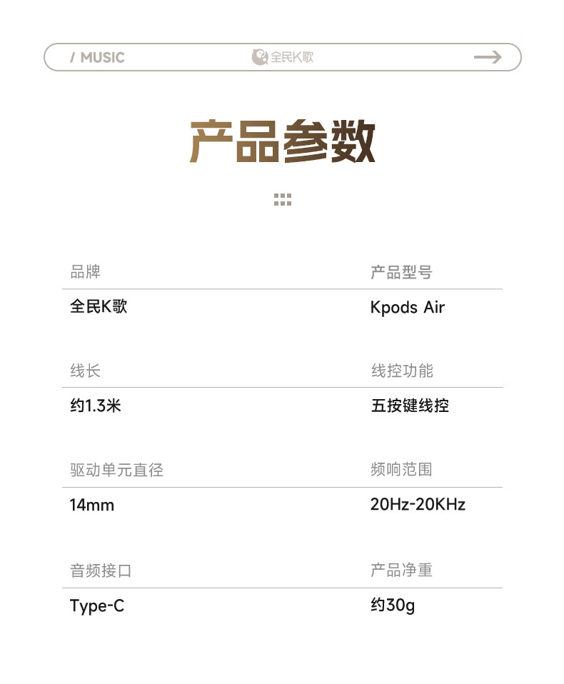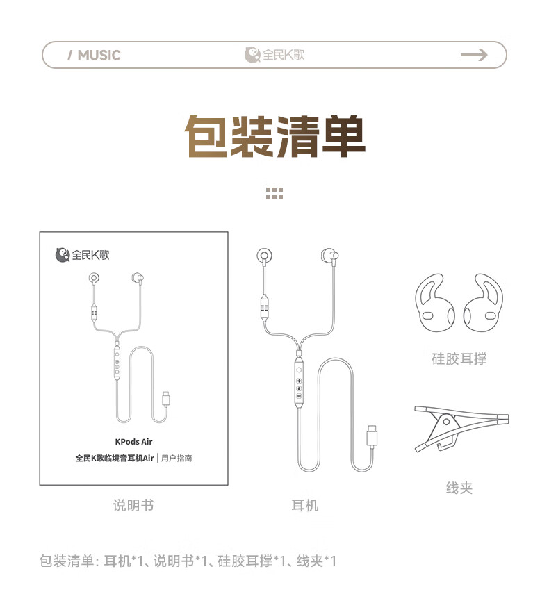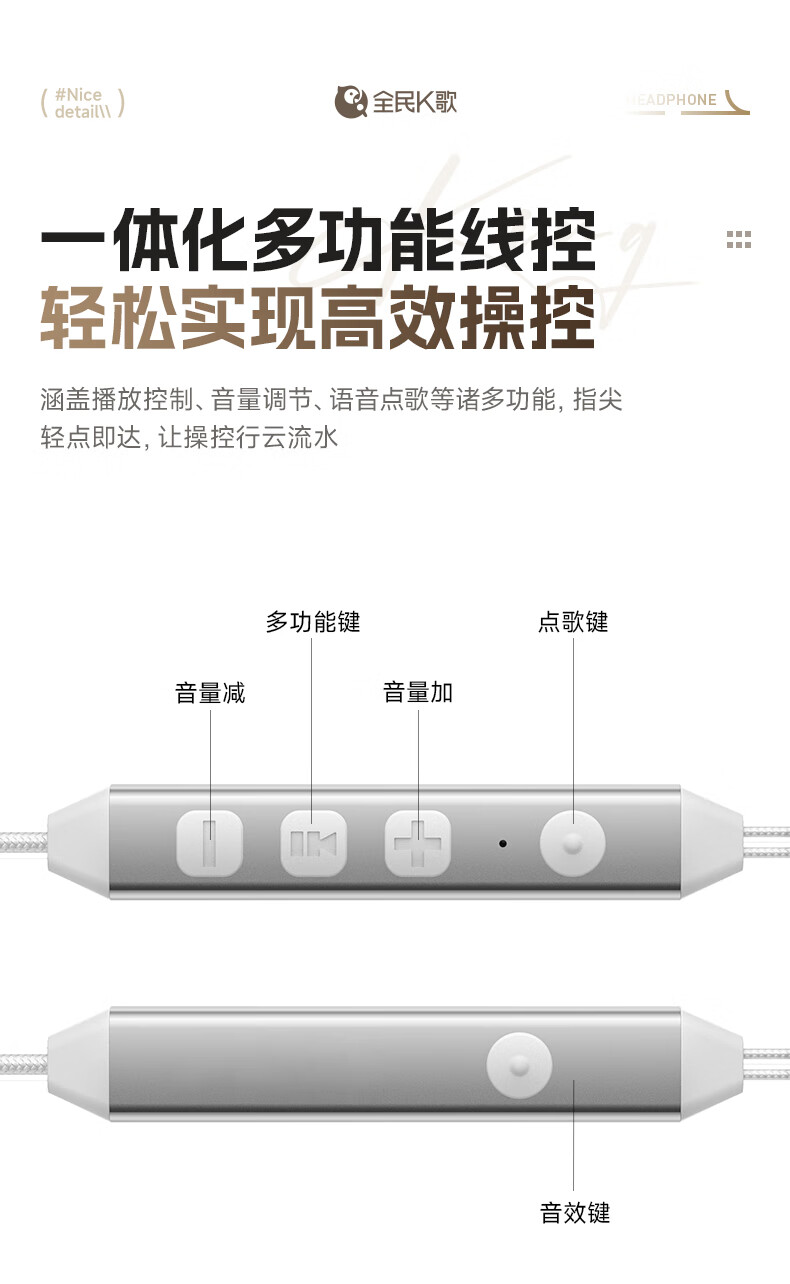 全民K歌腾讯音乐联合定制电脑声卡音箱线控K歌耳机麦克风自带耳返打分直播唱歌录音KPods Air白色