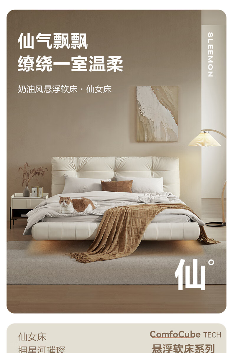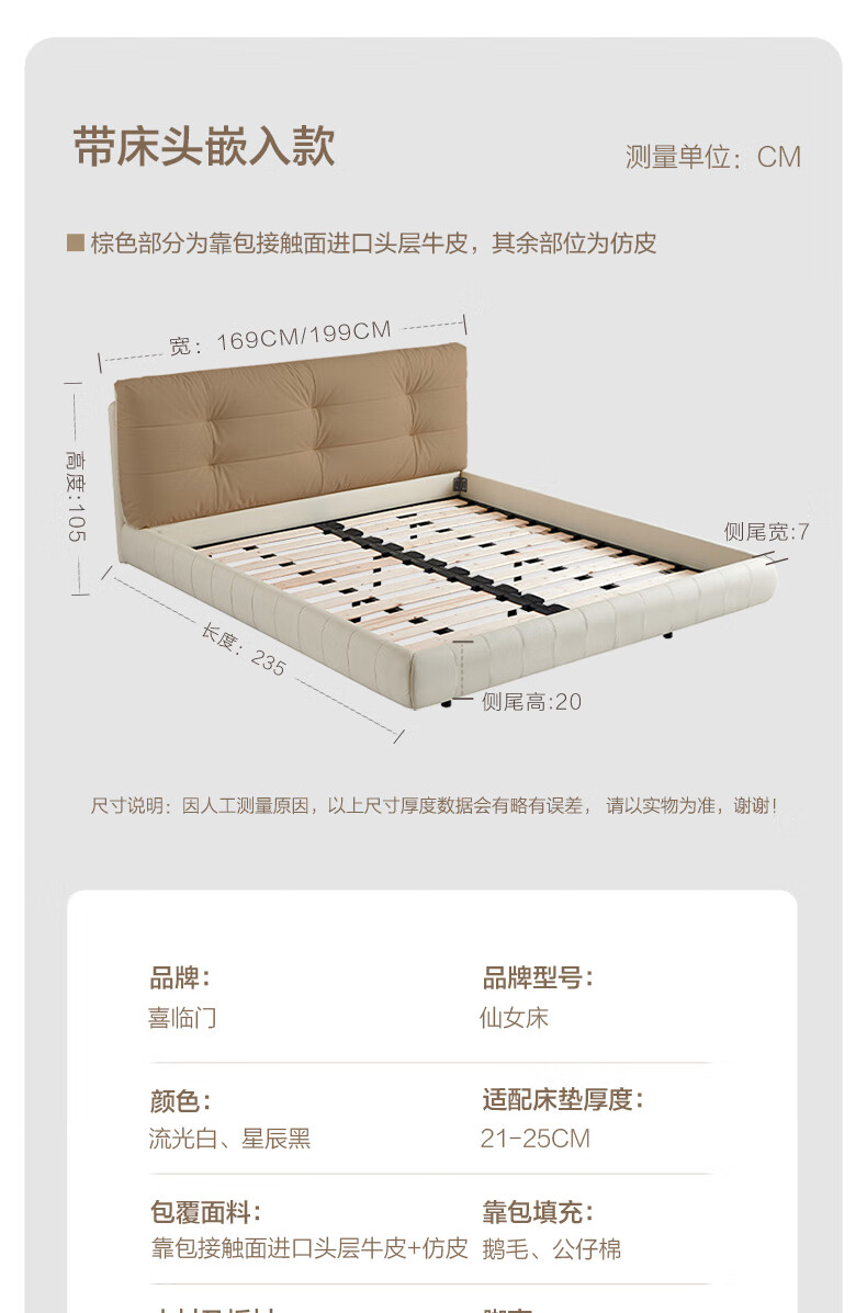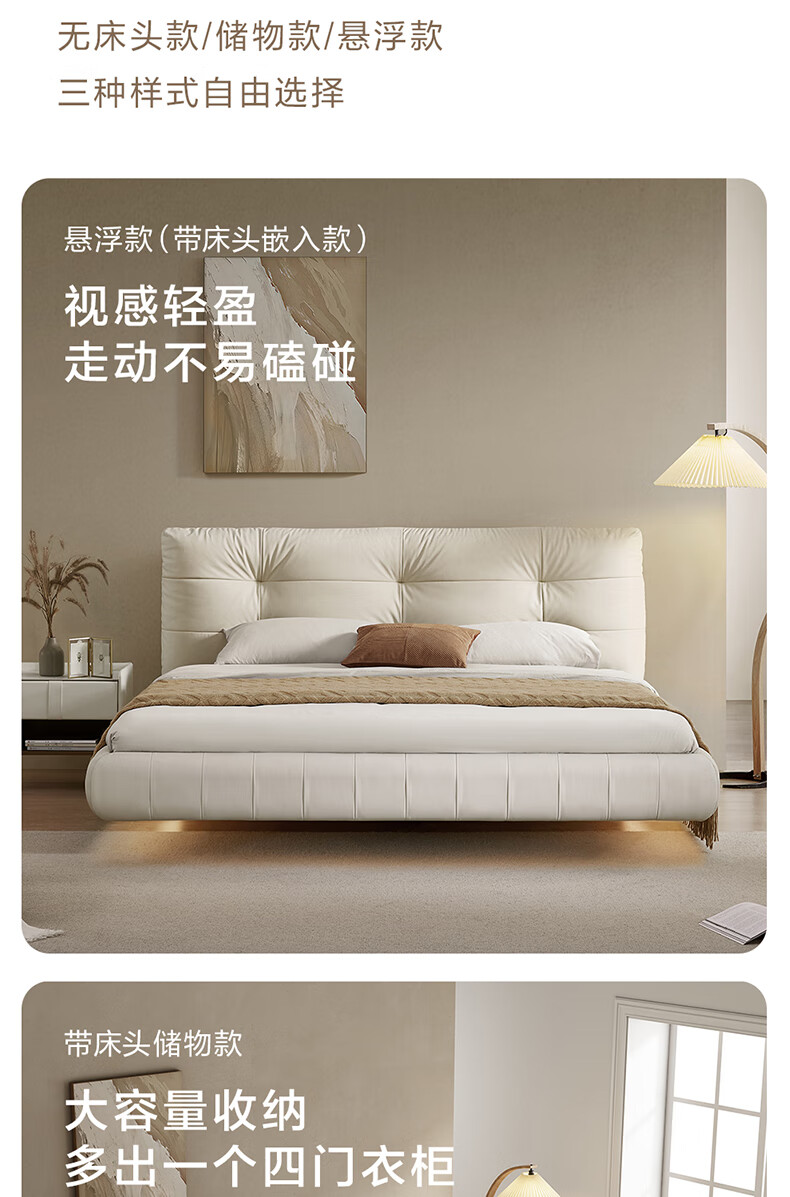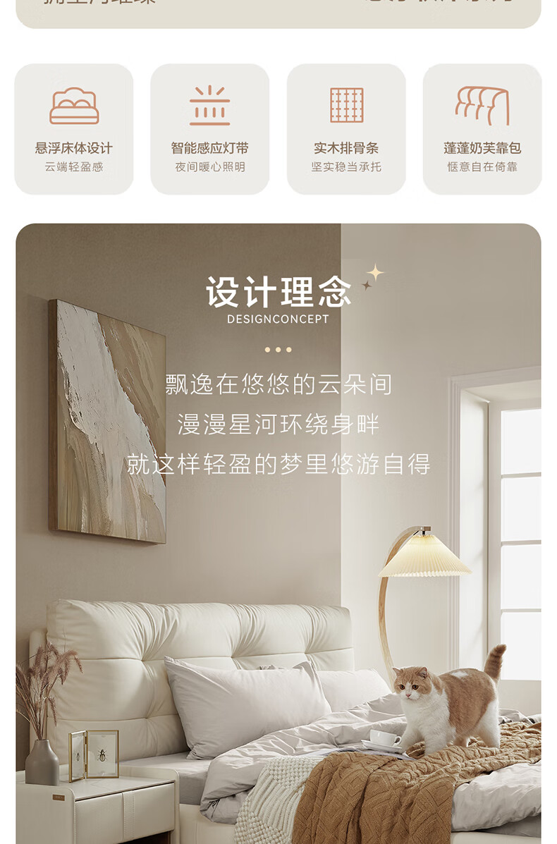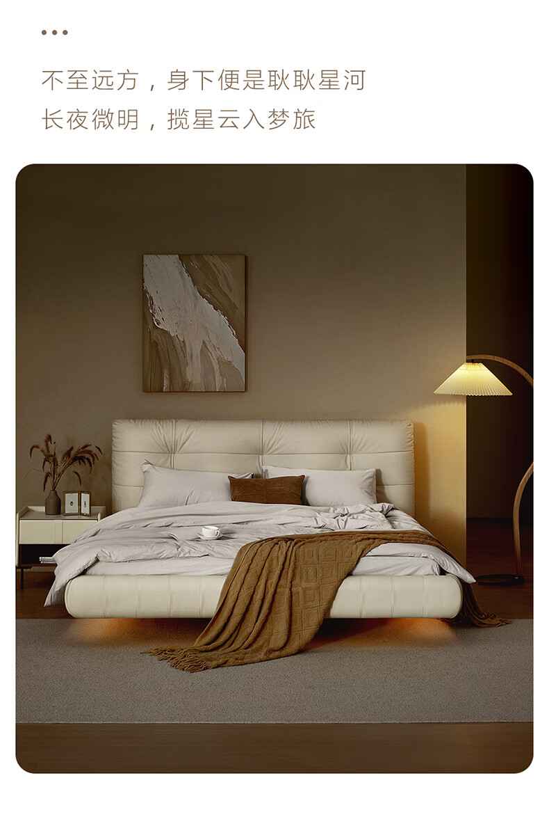喜临门奶油风悬浮双人大床 白骑士plus 仙女床带灯带皮床1.8*2米