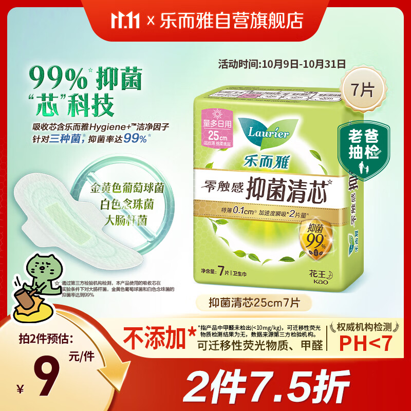 乐而雅花王【老爸抽检】零触感抑菌清芯日用卫生巾25cm7片姨妈巾自营