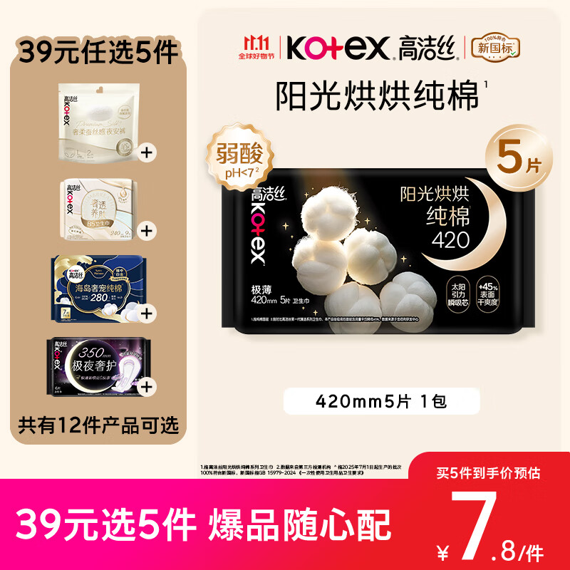 高洁丝【纯棉NO.1】阳光烘烘卫生巾420mm5片超长夜用姨妈巾京东自营旗舰