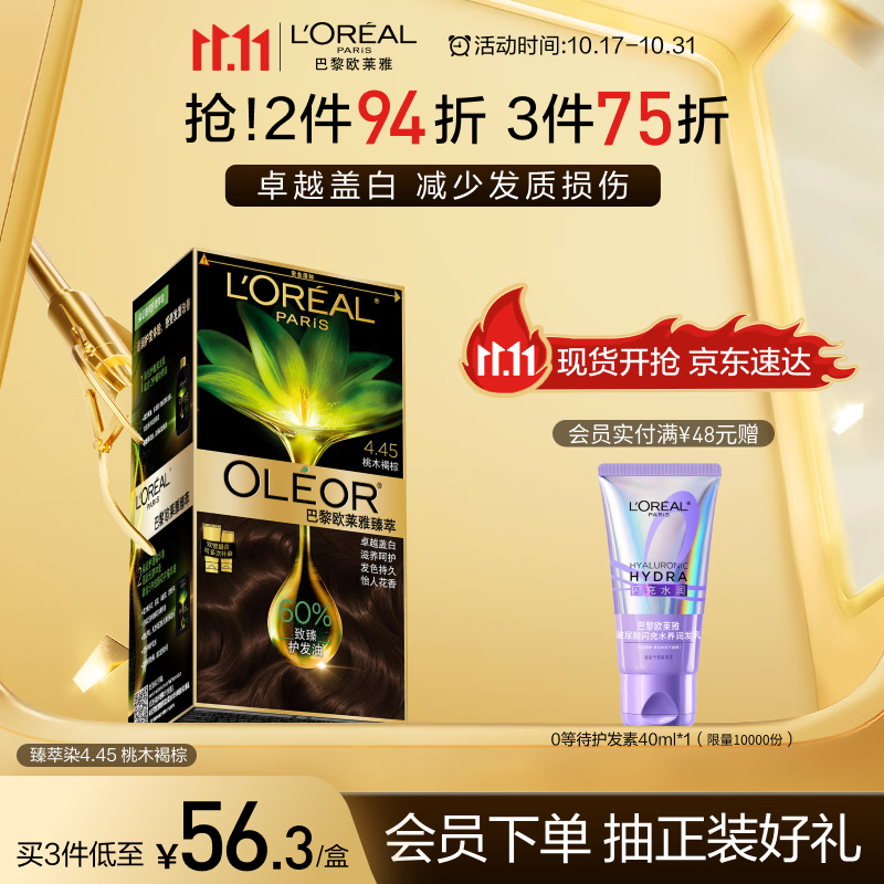 欧莱雅臻萃精油染染发剂 男女遮盖白发 自己在家染发膏4.45桃木褐棕
