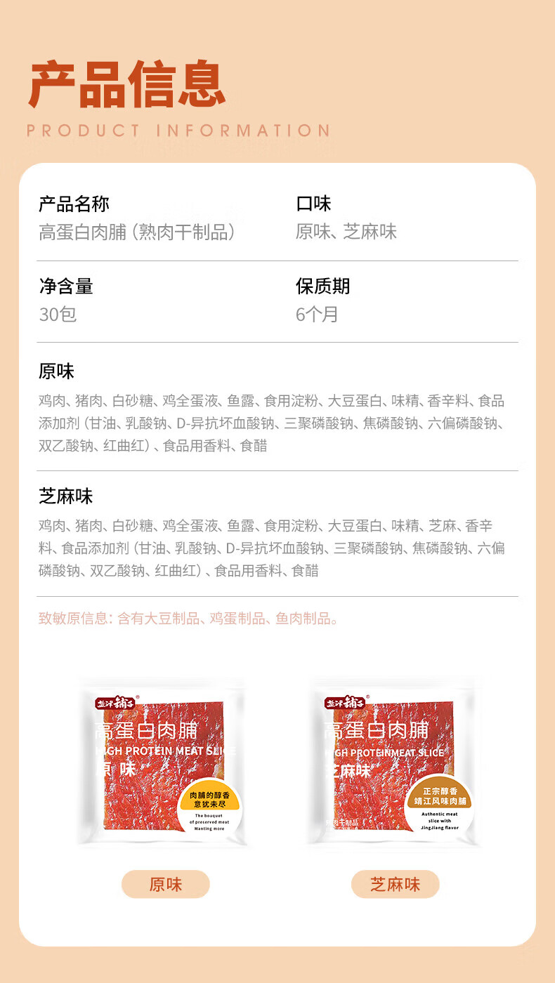 盐津铺子 肉脯休闲食品 手撕肉片干鸡肉脯猪肉脯芝麻味原味零食小吃 高蛋白肉脯(原味) 共30包约85g