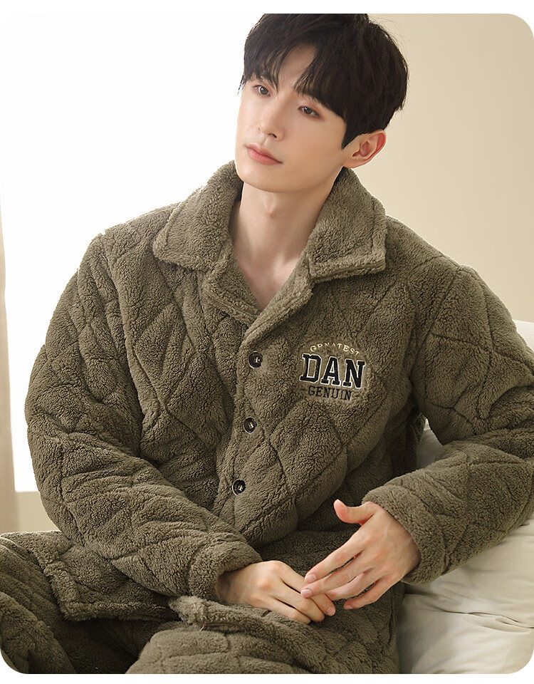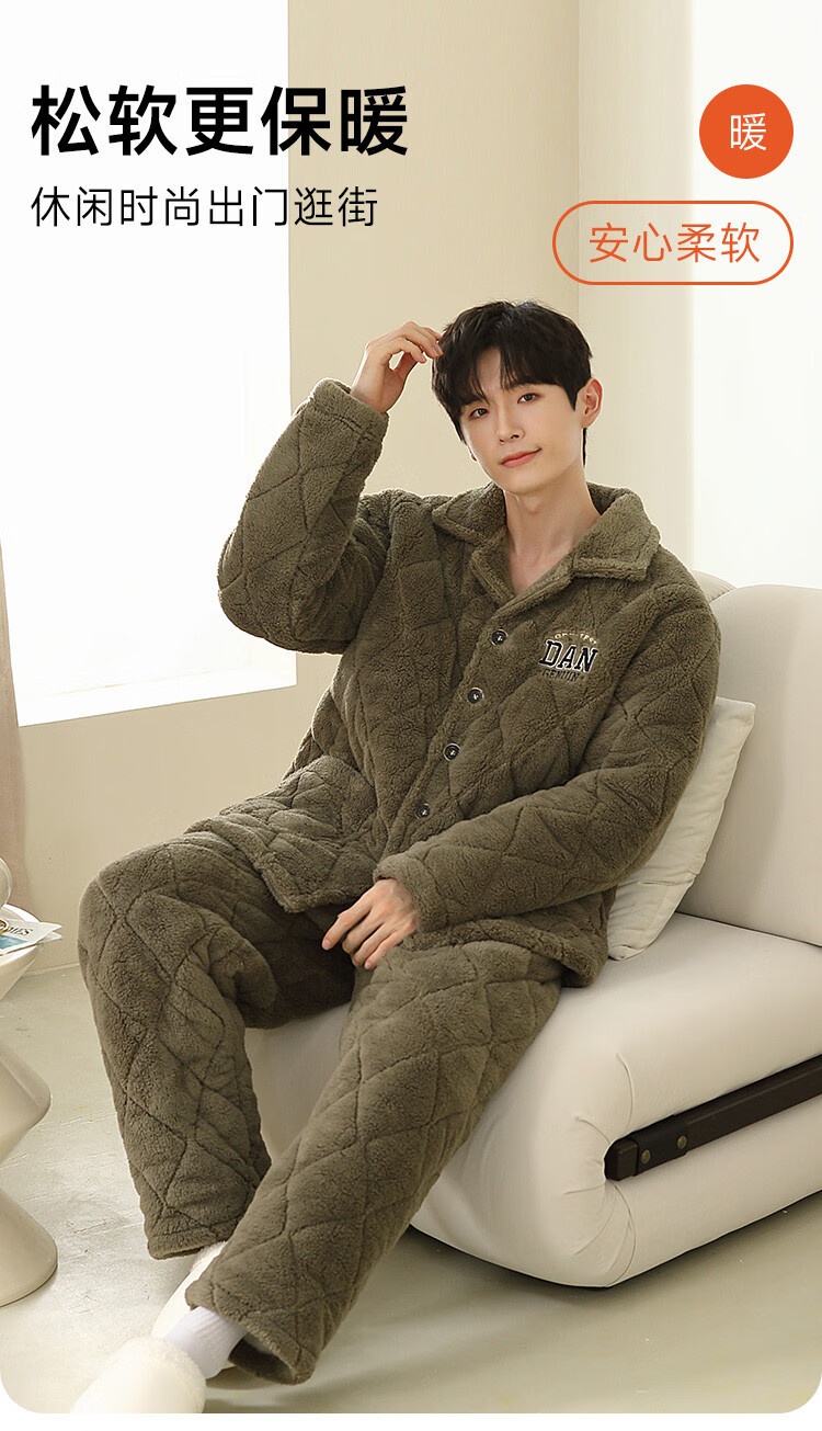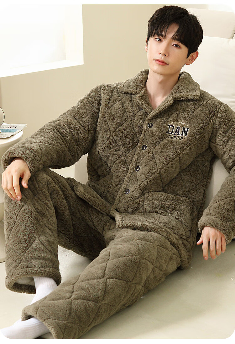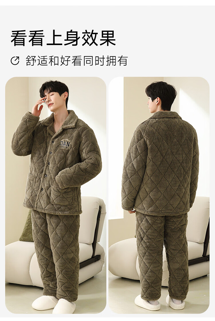 香蜜闺秀【三层夹棉加厚】男士睡衣秋冬新款长袖可外穿保暖男士家居服套装 卡其 XL