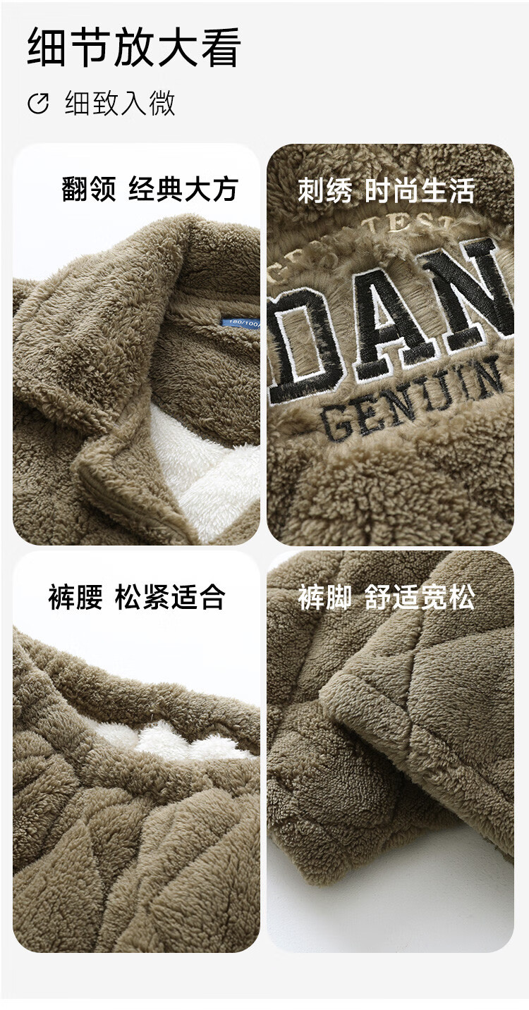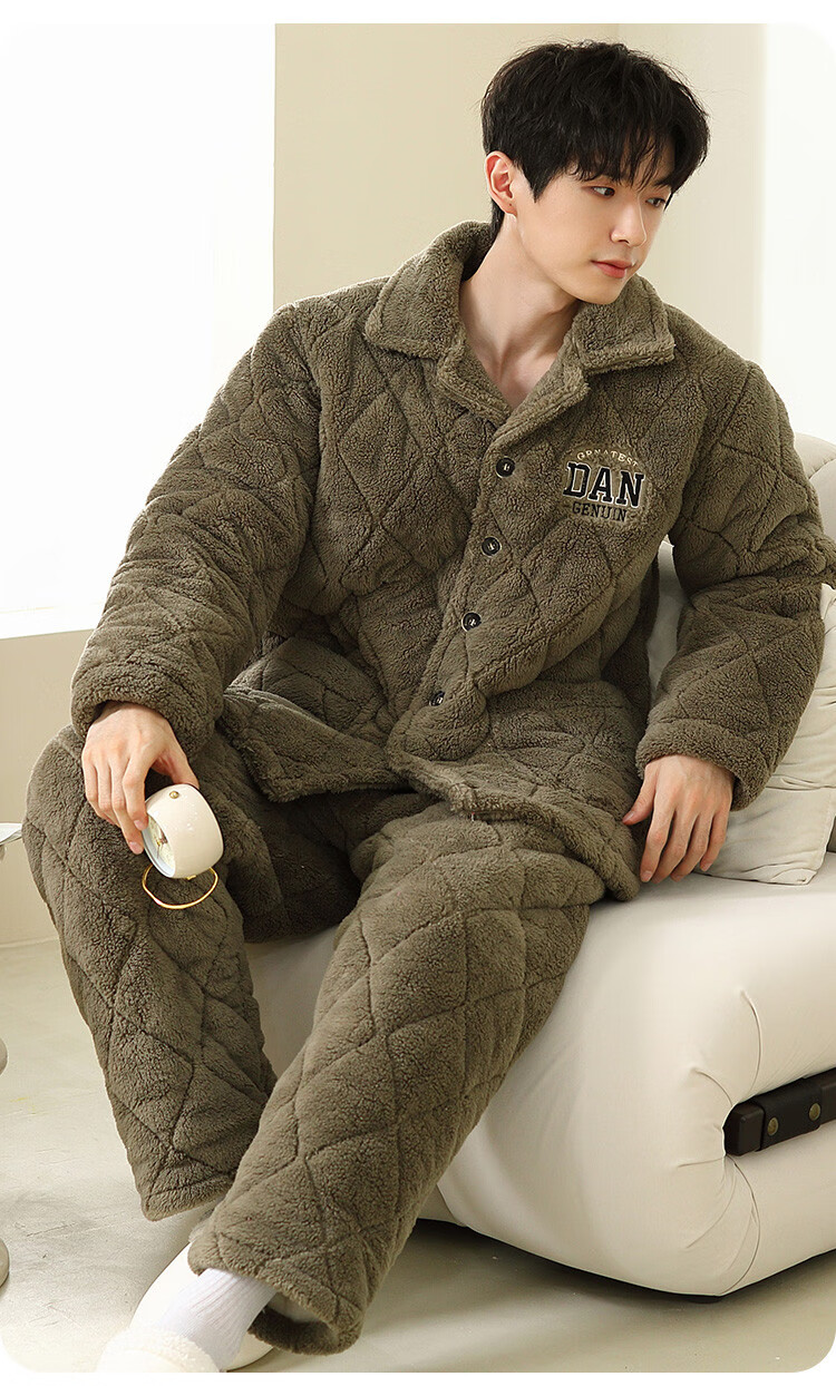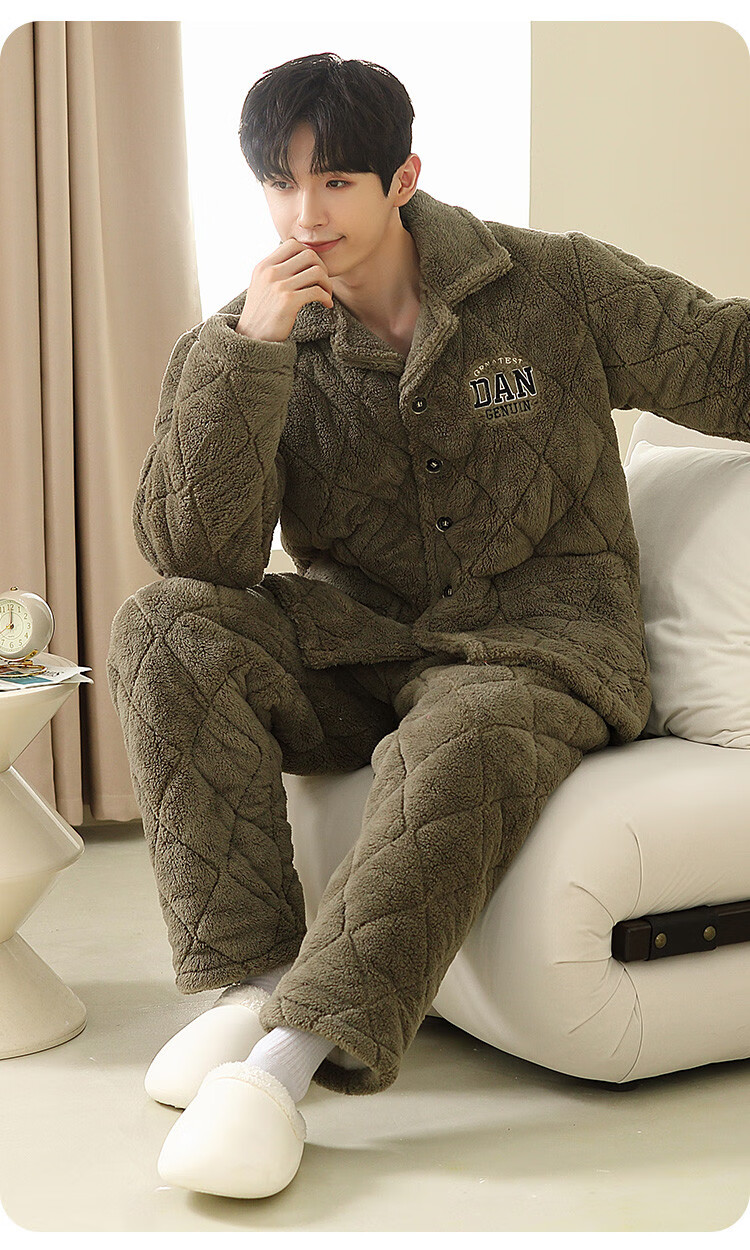 香蜜闺秀【三层夹棉加厚】男士睡衣秋冬新款长袖可外穿保暖男士家居服套装 卡其 XL