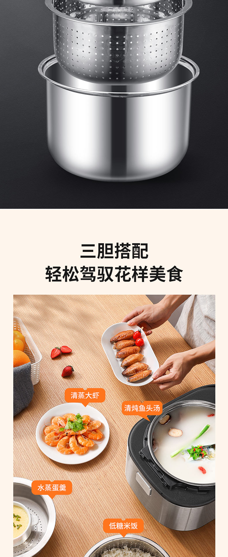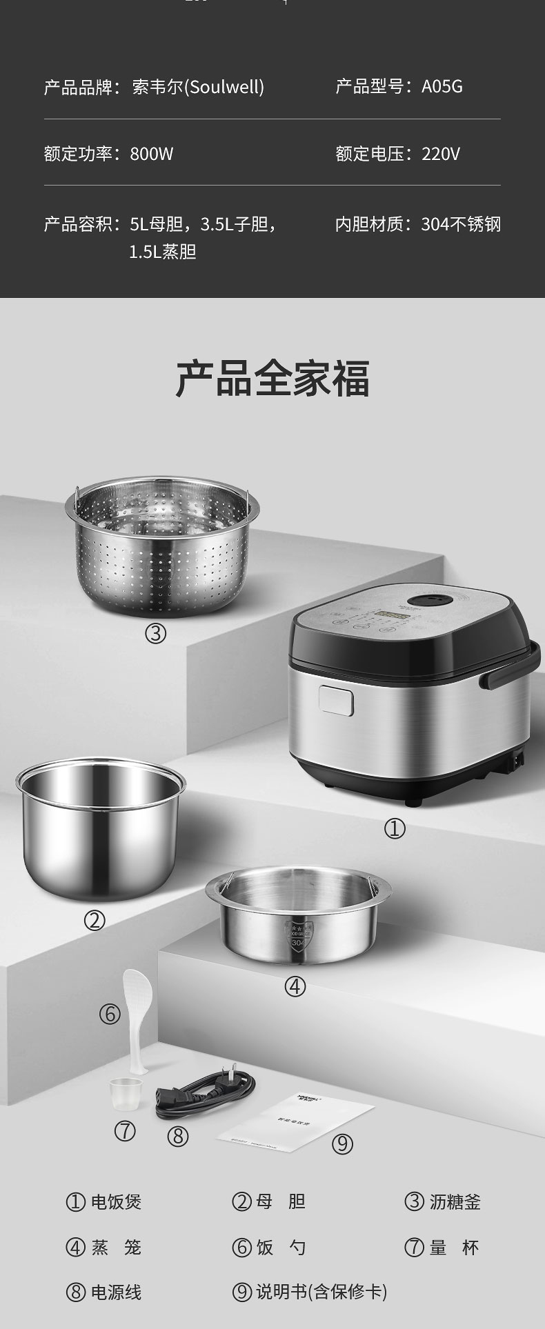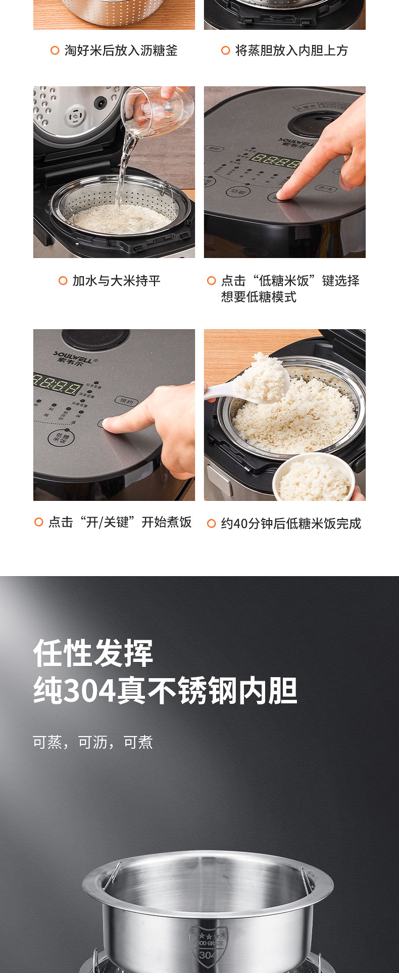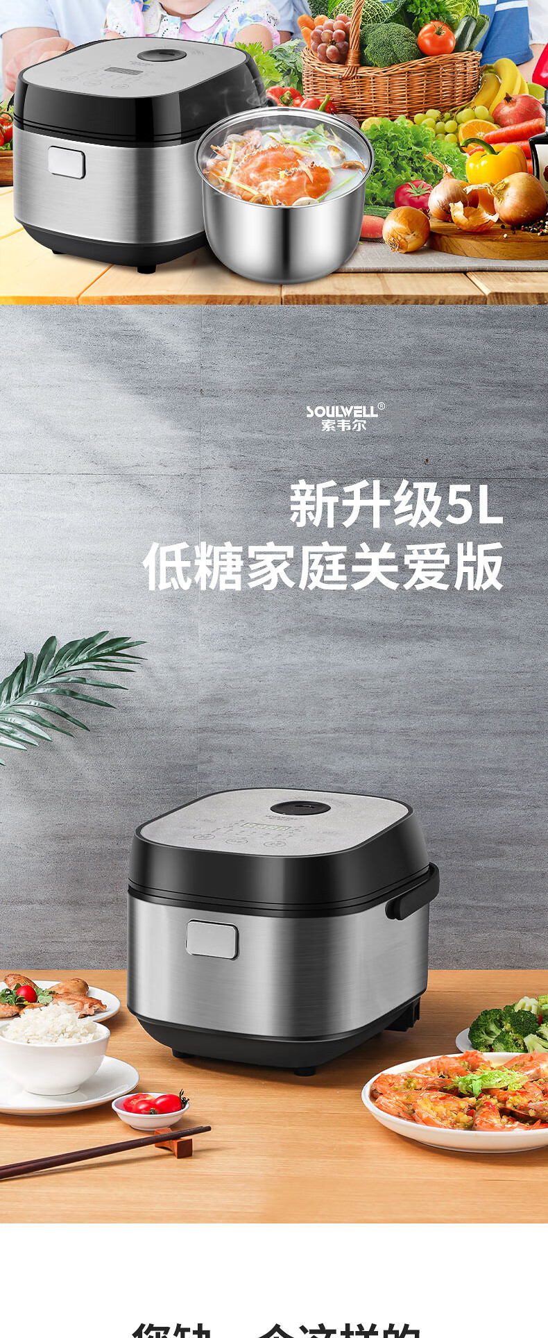 索韦尔 低糖电饭煲电饭煲 米汤分离蒸沥米饭家用养生不锈钢多功能智能电饭锅 极致银5L-三胆-304内盖升级款 5L