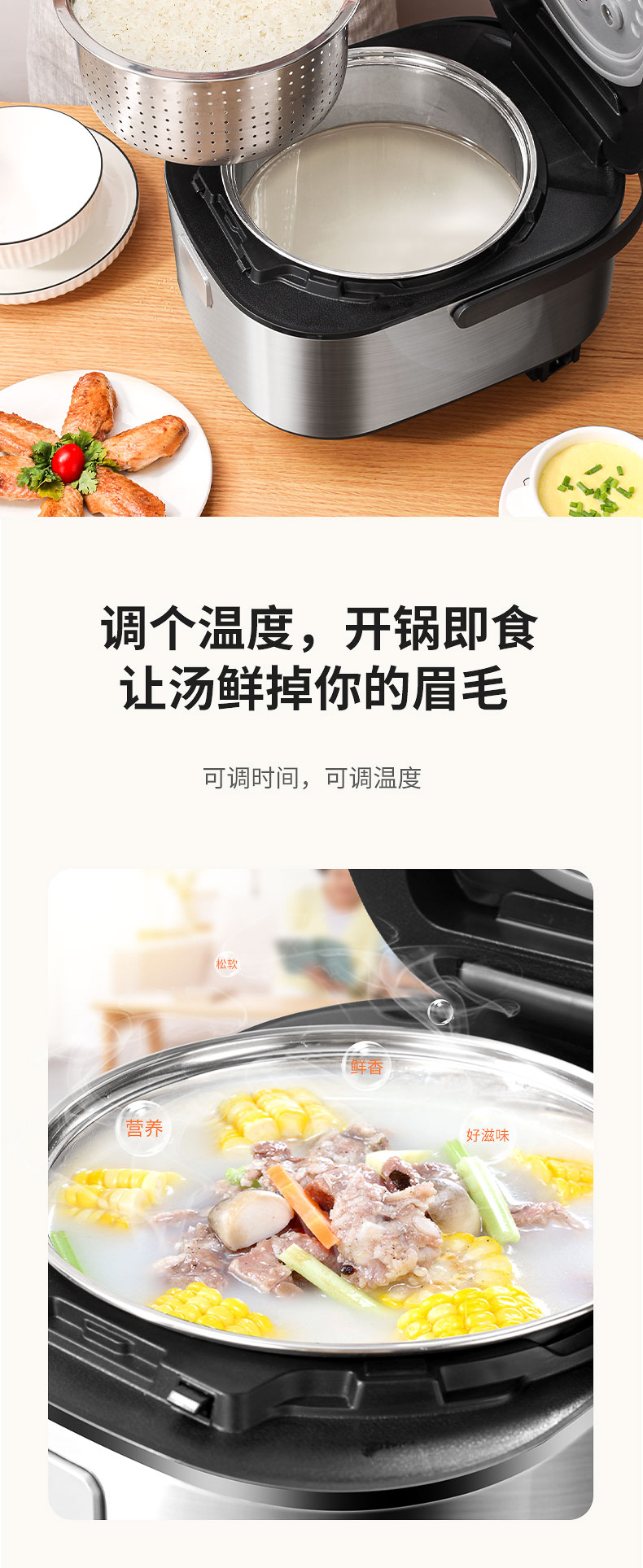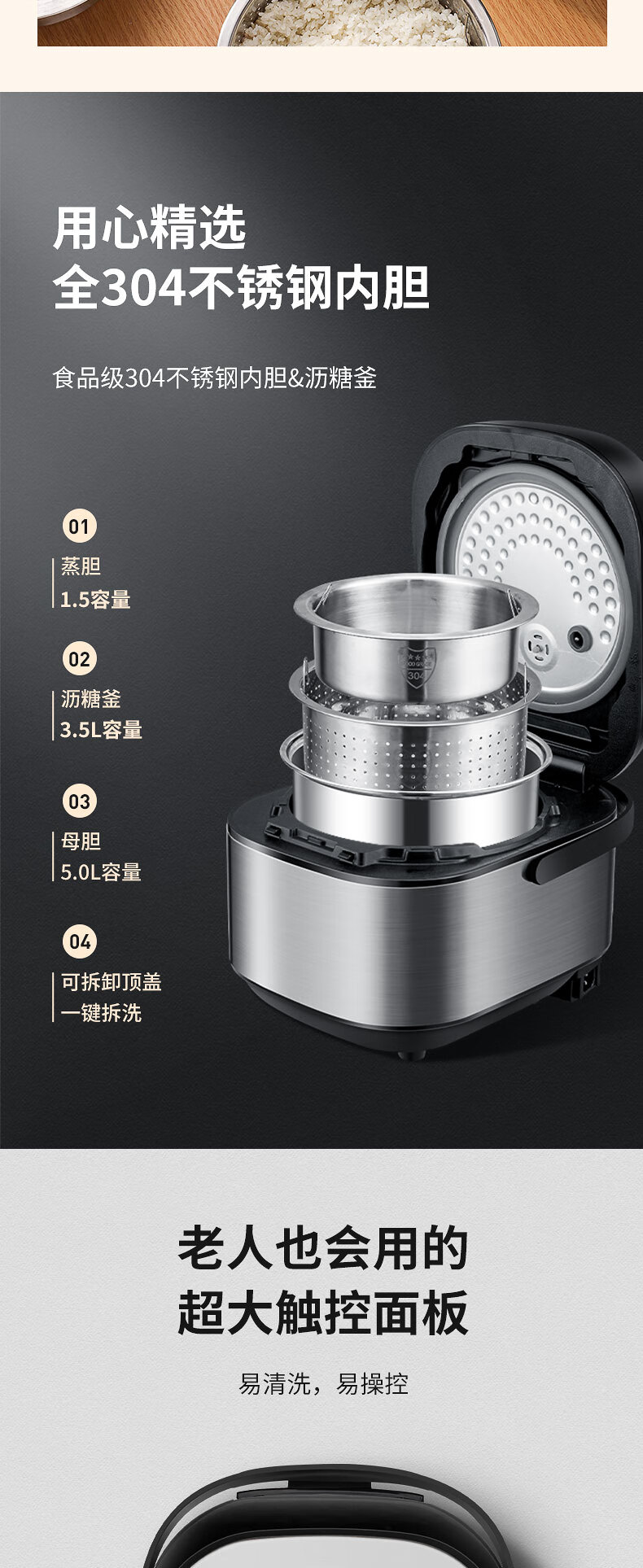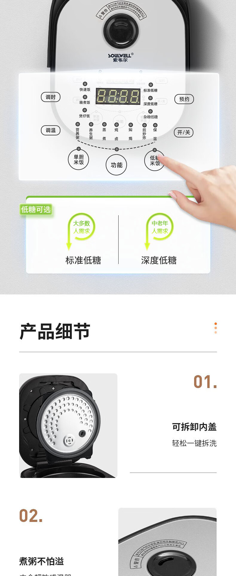 索韦尔 低糖电饭煲电饭煲 米汤分离蒸沥米饭家用养生不锈钢多功能智能电饭锅 极致银5L-三胆-304内盖升级款 5L