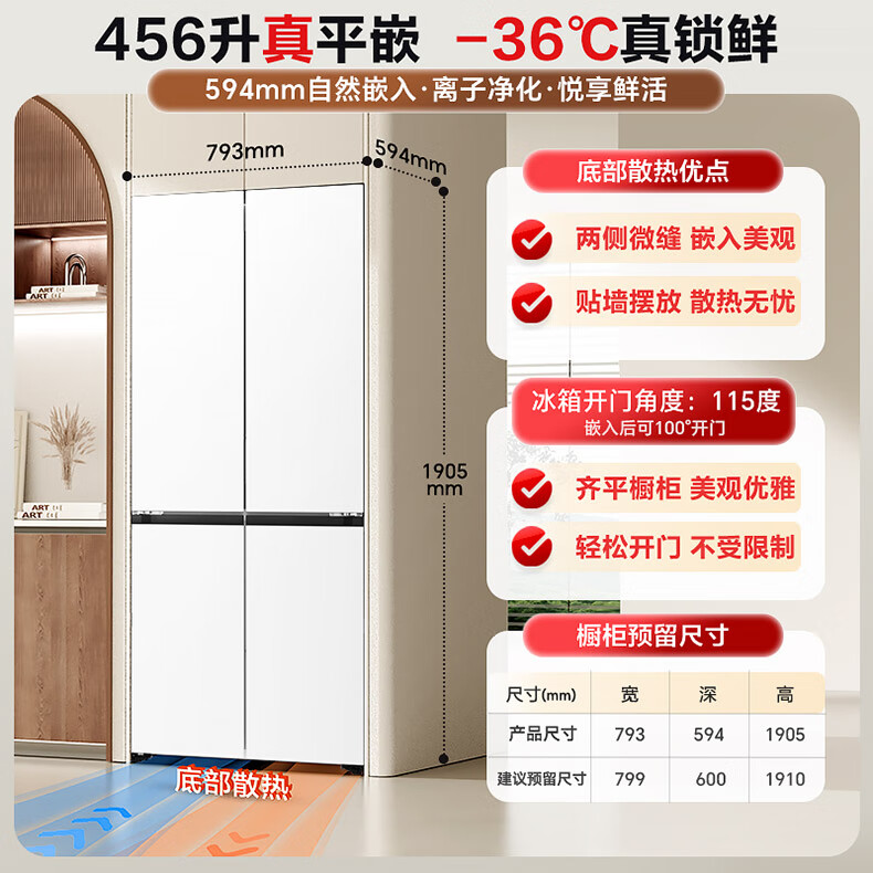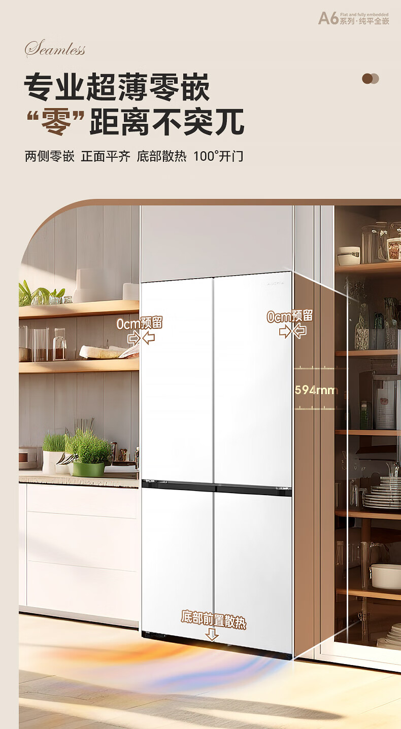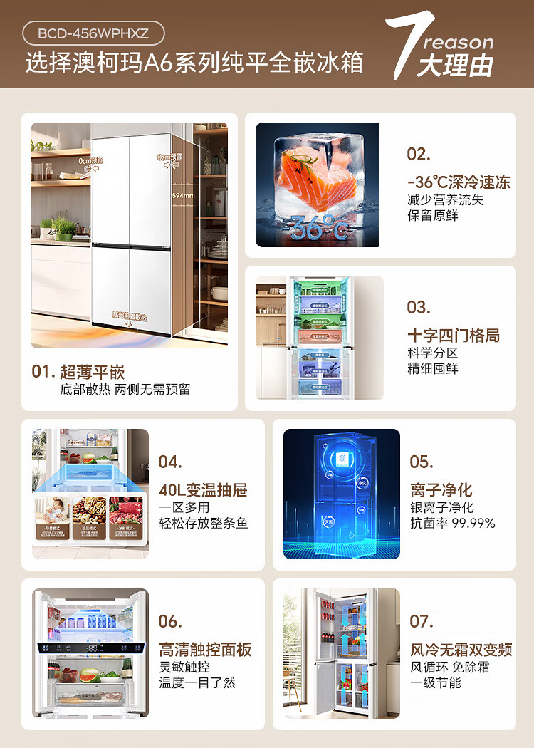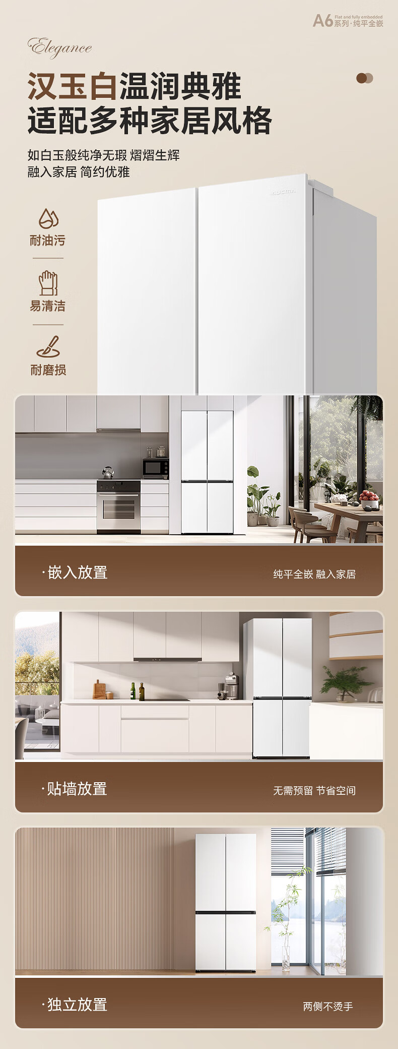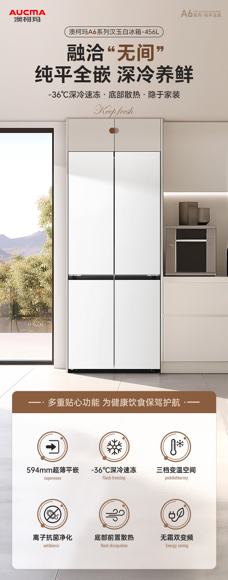 澳柯玛(AUCMA)456升平嵌超薄白色十字对开多门风冷无霜变频家用纯平全嵌入银离子保鲜大冰箱BCD-456WPHXZ BCD-456WPHXZ