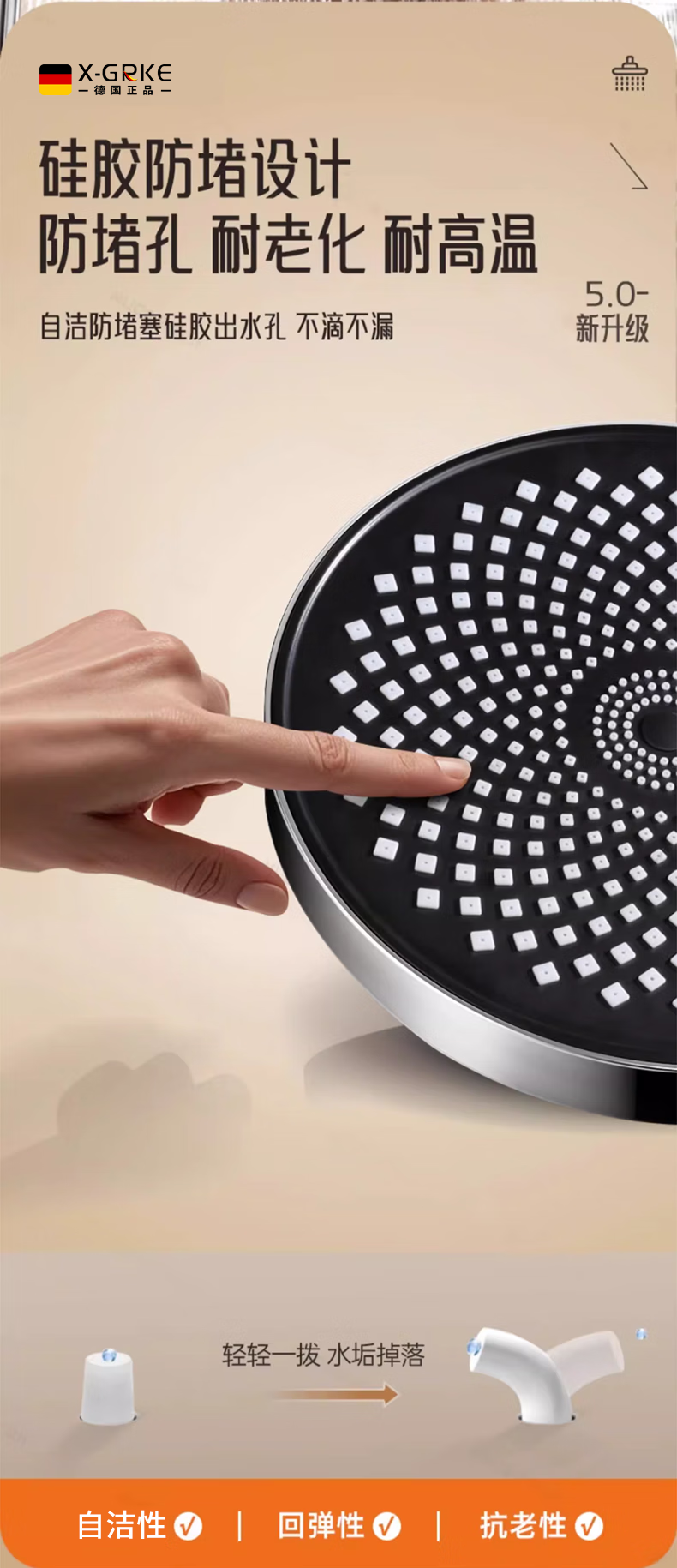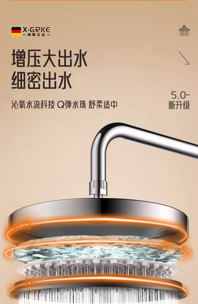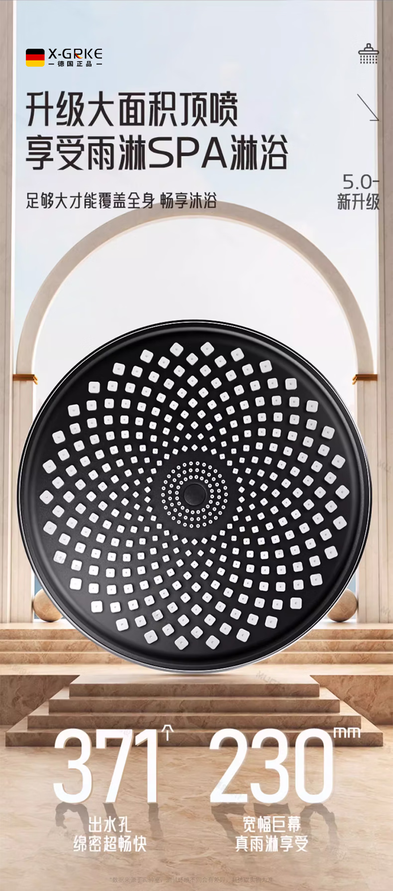 X-GRKE【德国】淋浴花洒顶喷头家用浴室增压大出水沐浴洗澡莲蓬喷头 230mm超大面板【硅胶防堵孔】银色 硅胶防堵出水孔丨蓄力增压大水