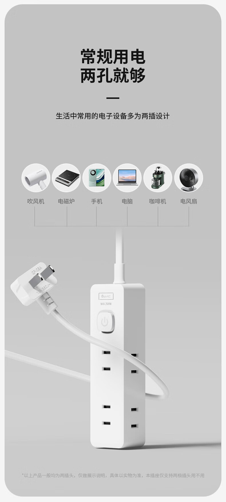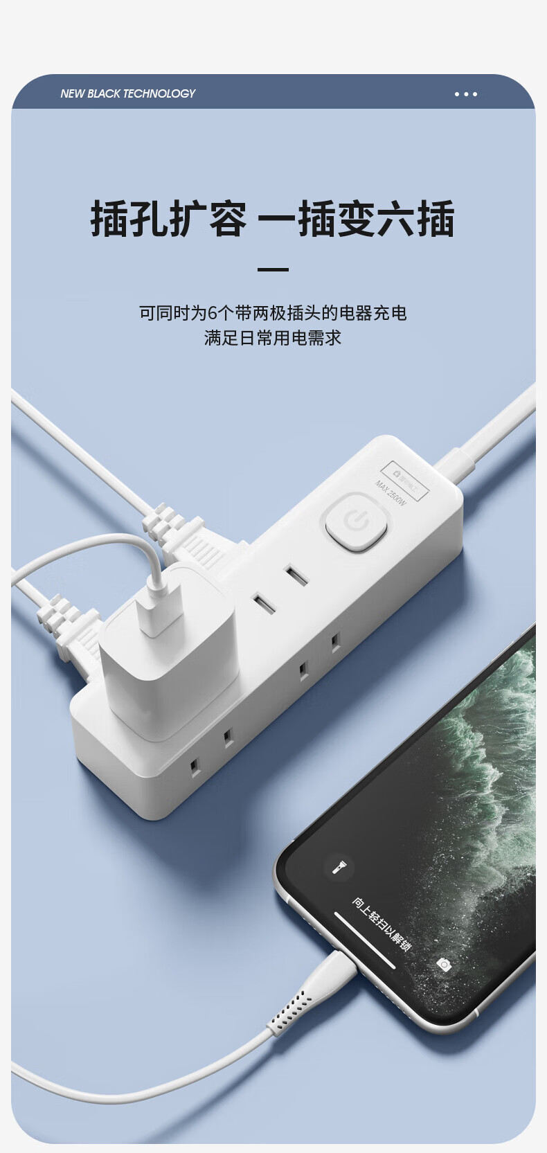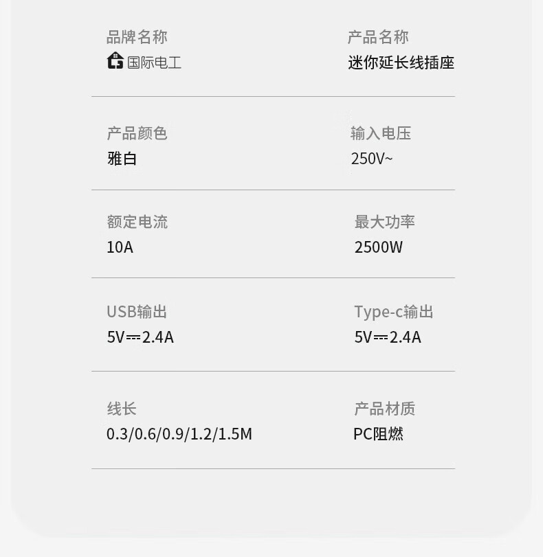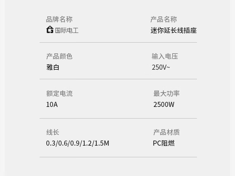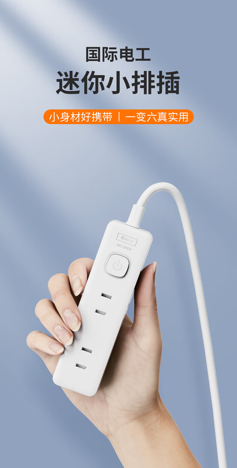 国际电工家用插座两脚插头插线板电源延长两孔二插孔插板带线迷你小型插排 一转六迷你插排-0.6米【两脚插头】