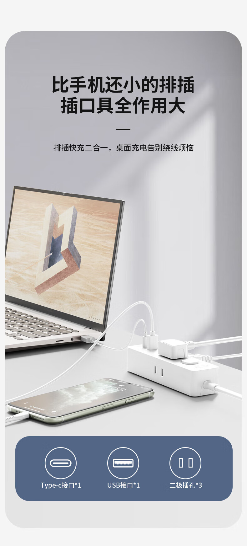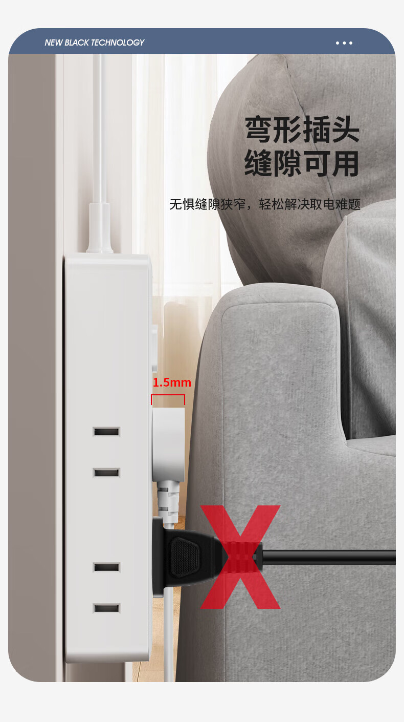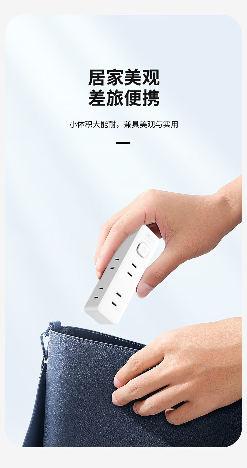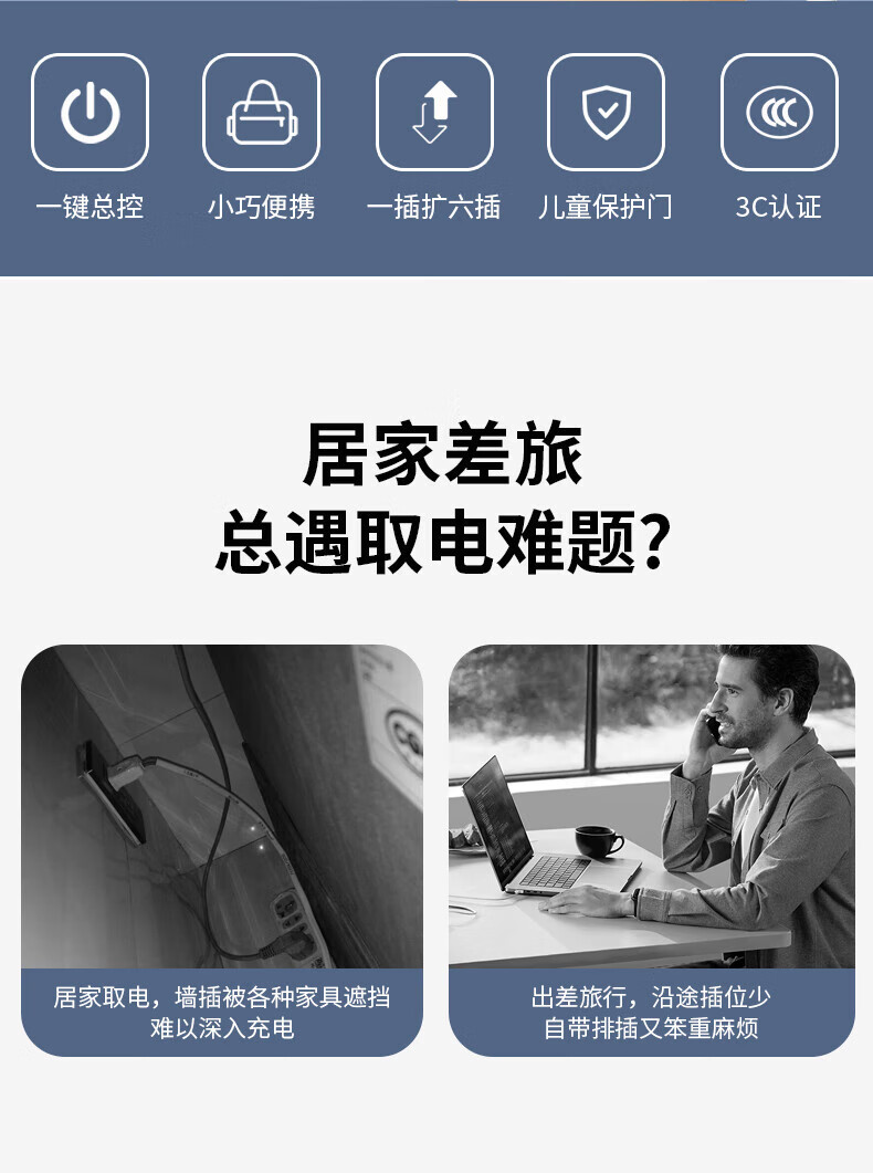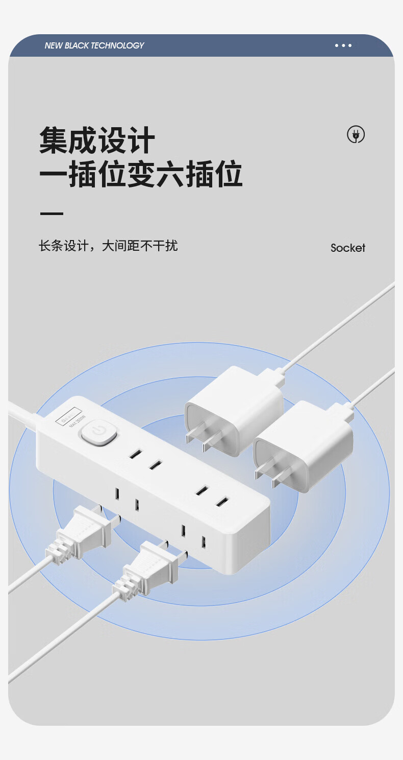 国际电工家用插座两脚插头插线板电源延长两孔二插孔插板带线迷你小型插排 一转六迷你插排-0.6米【两脚插头】