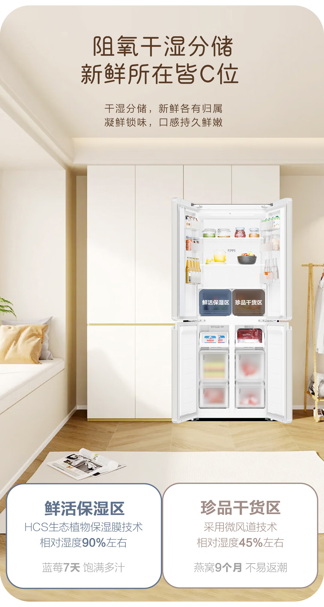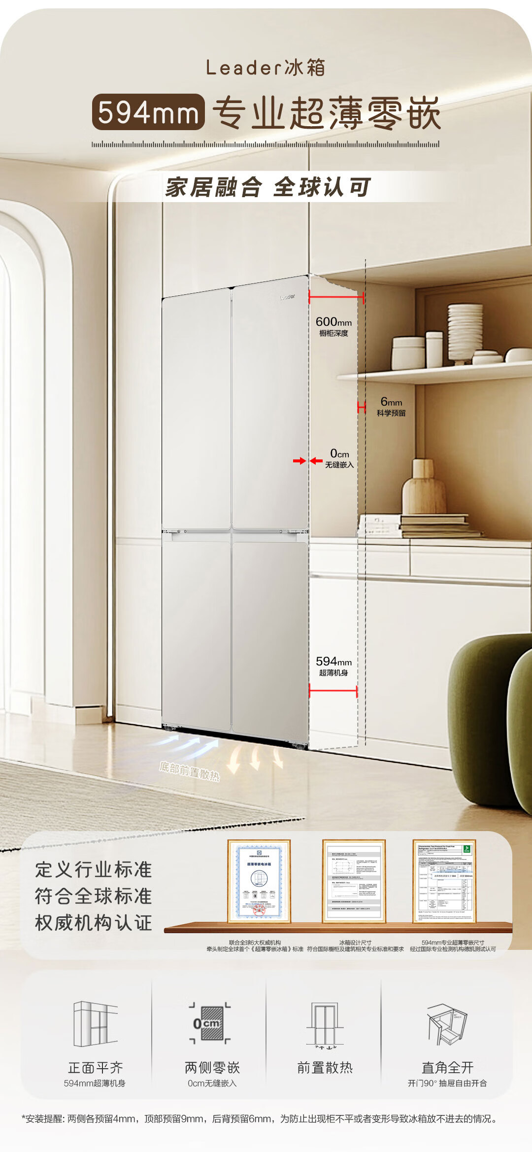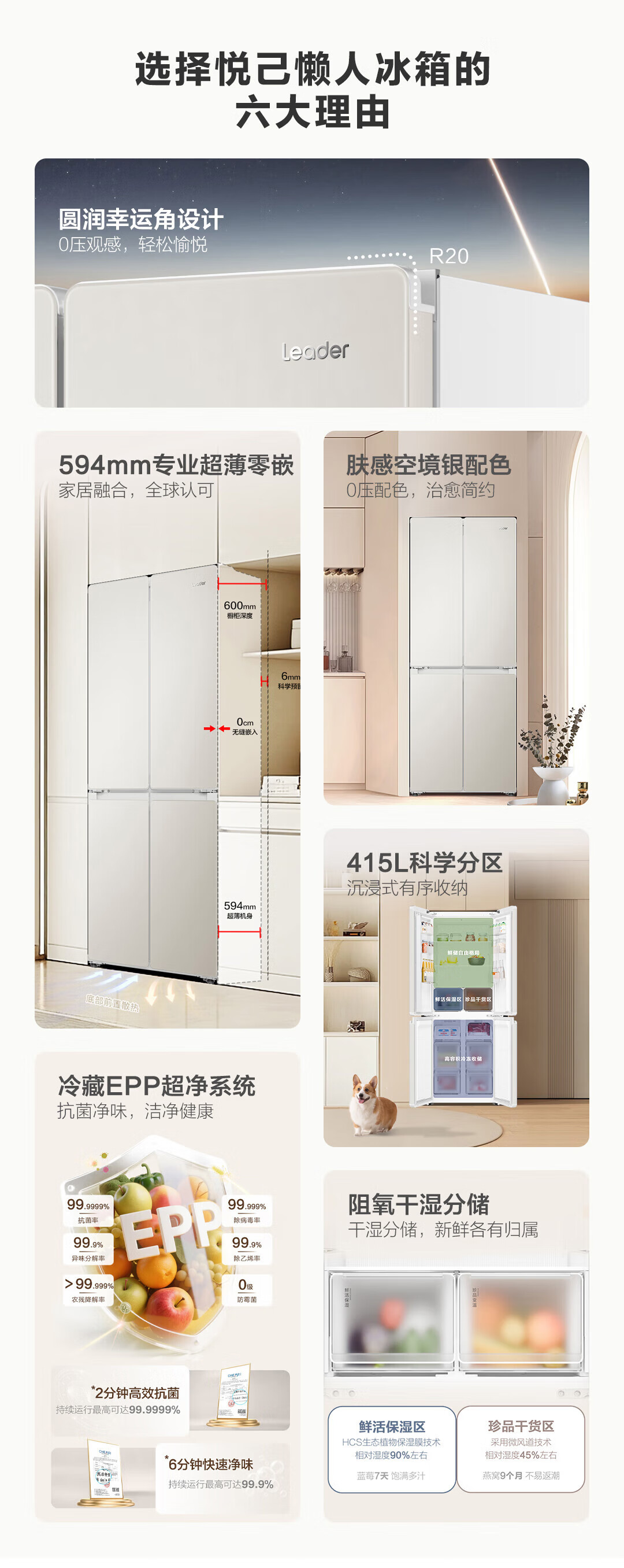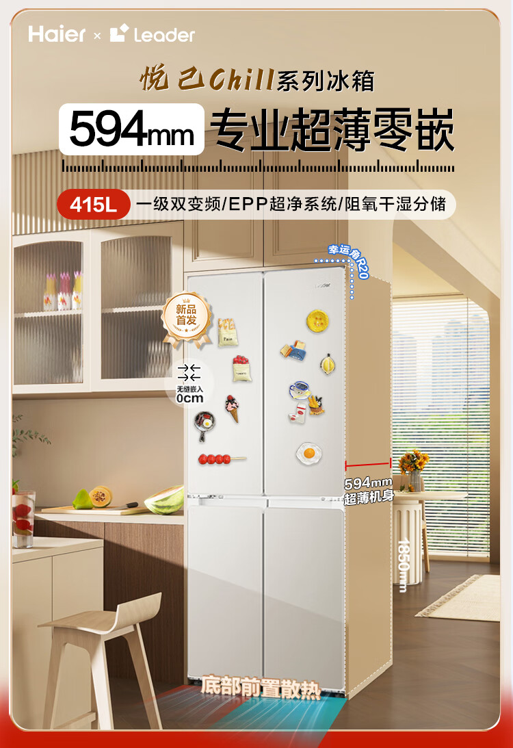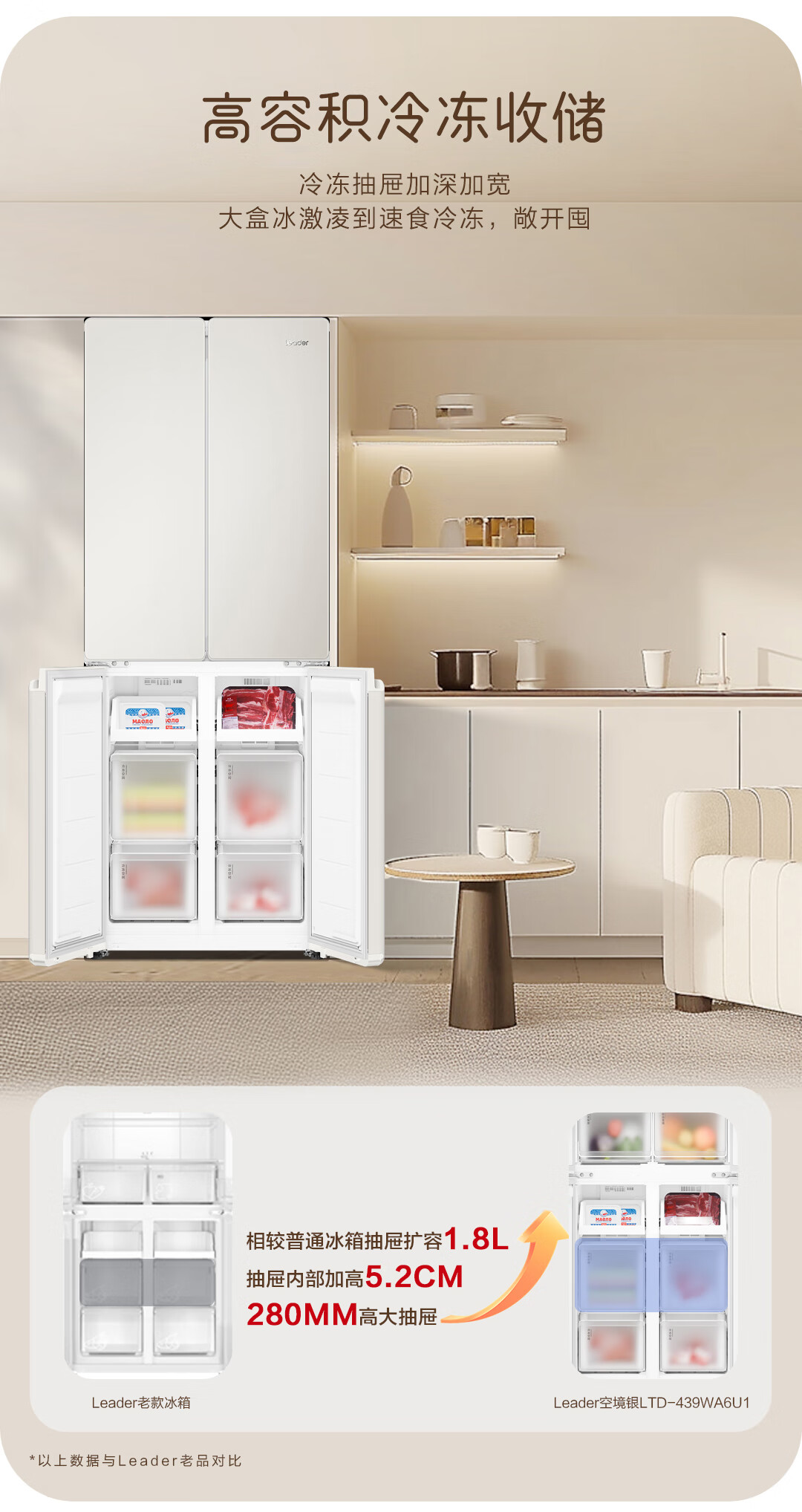海尔出品统帅Leader冰箱439十字四门超薄594mm零嵌415升变频一级能效EPP超净Leader电冰箱 超薄594mm零嵌+EPP净+阻氧干湿分储