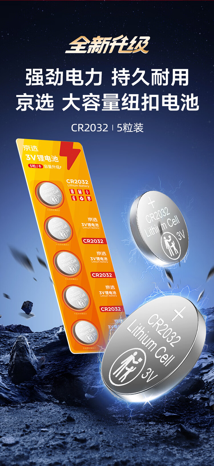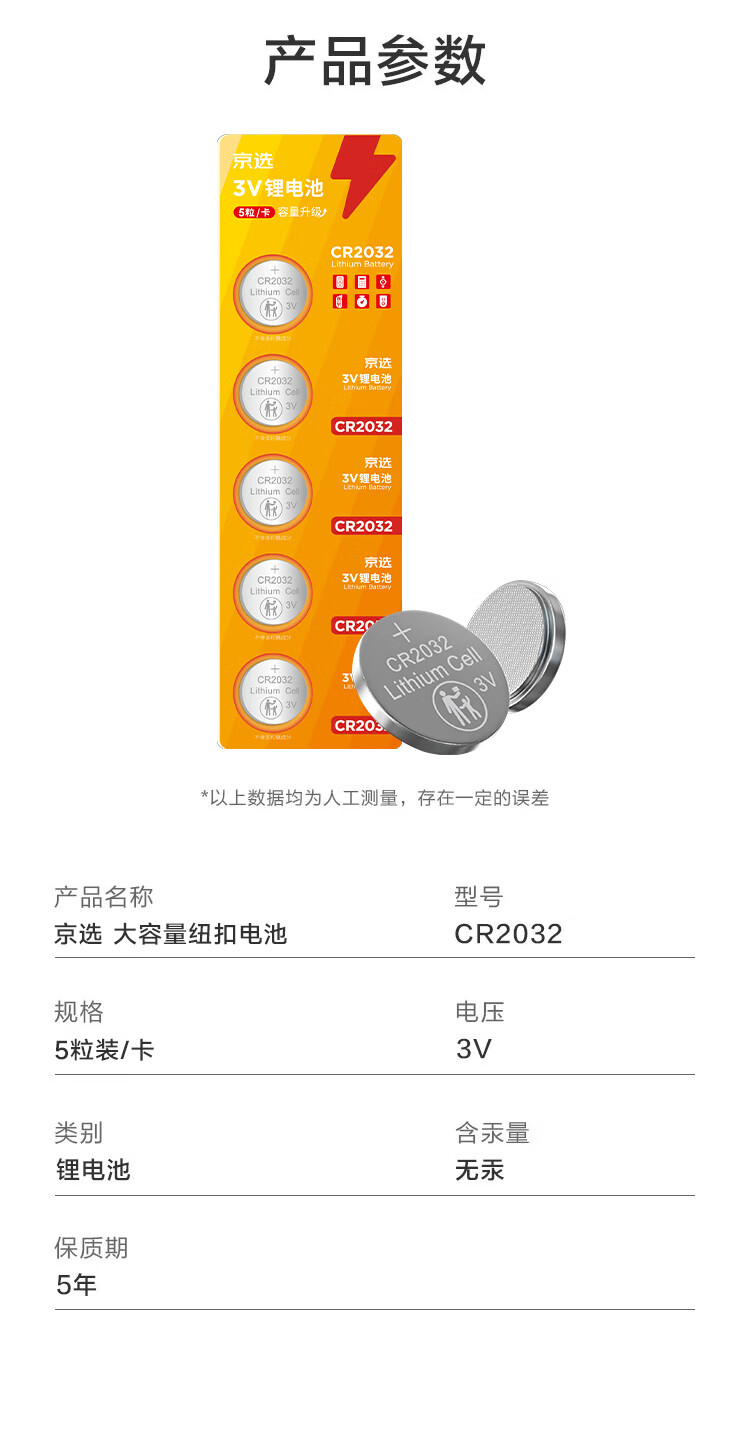 京选 京东自有品牌 CR2032纽扣电池5粒装 适用汽车钥匙手表遥控器电脑主板对讲机【单件包邮】