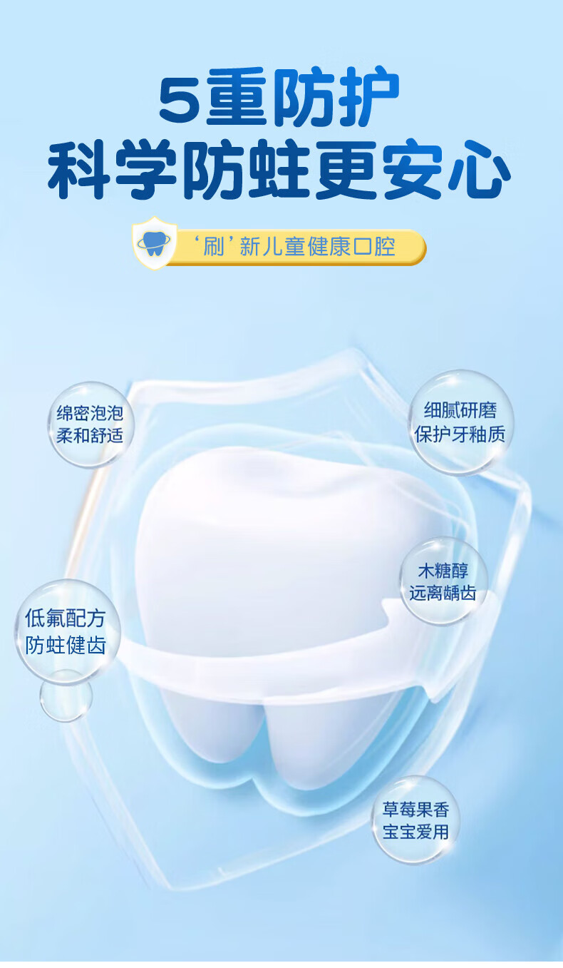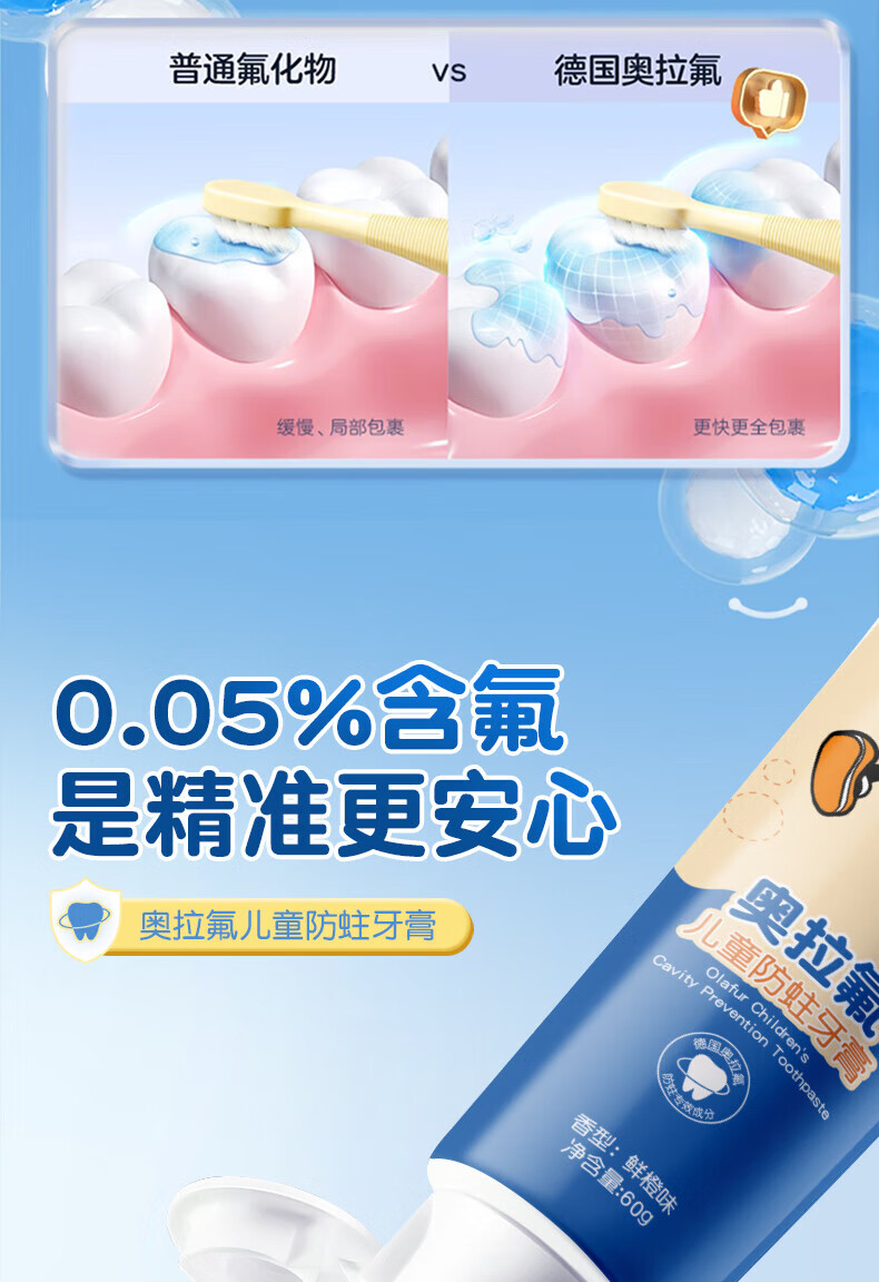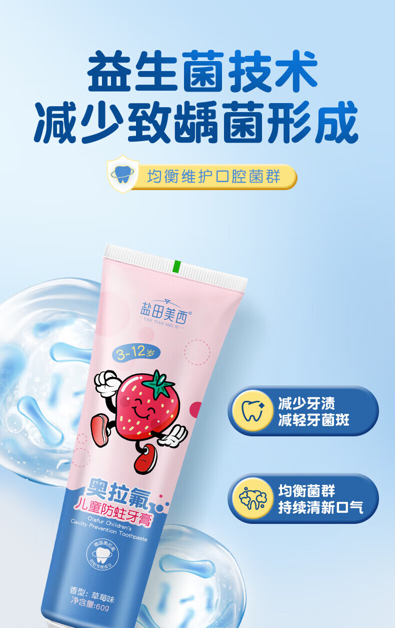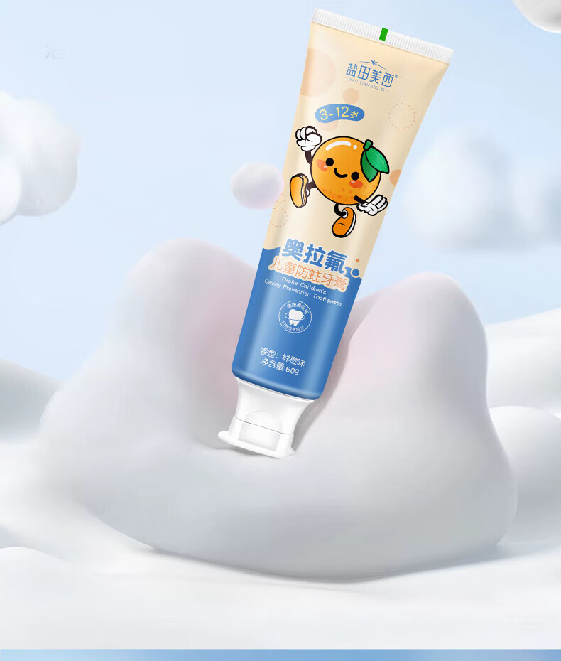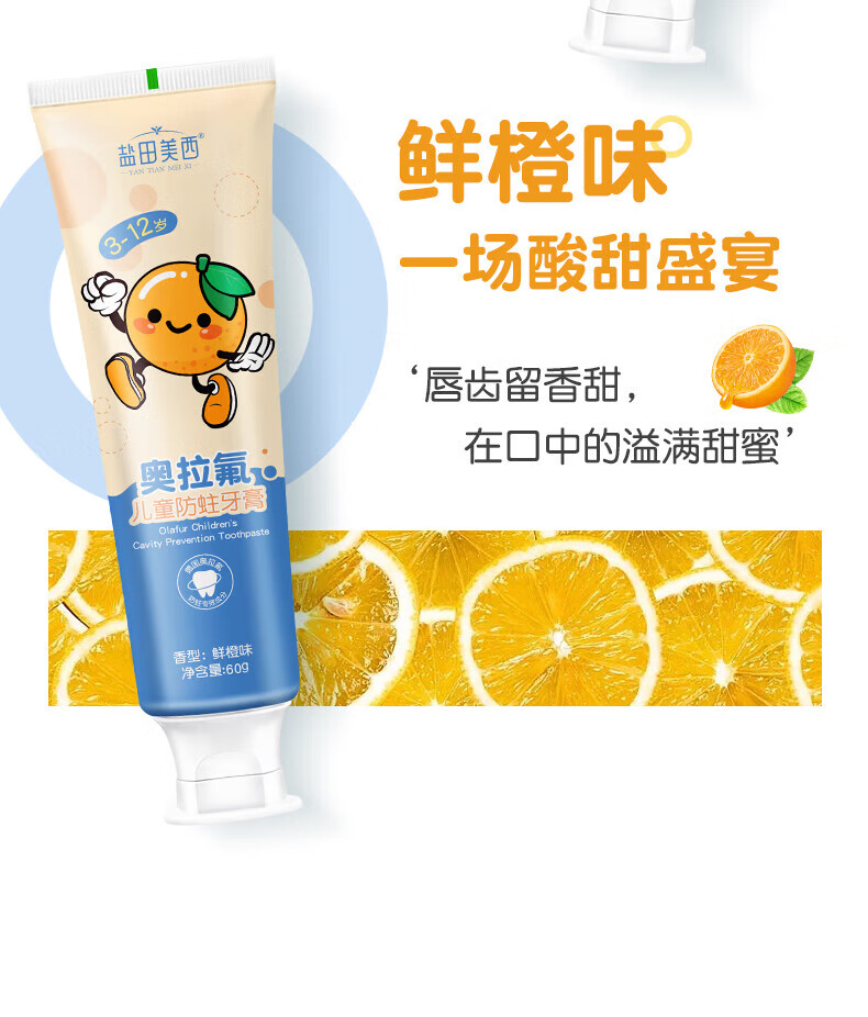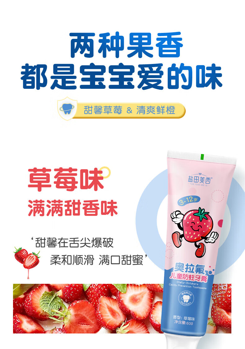 盐田美西儿童防蛀牙膏宝宝3-6-12岁换牙期防龋齿蛀牙护龈含氟牙膏不辣口 儿童牙膏60g-草莓+香橙各一支