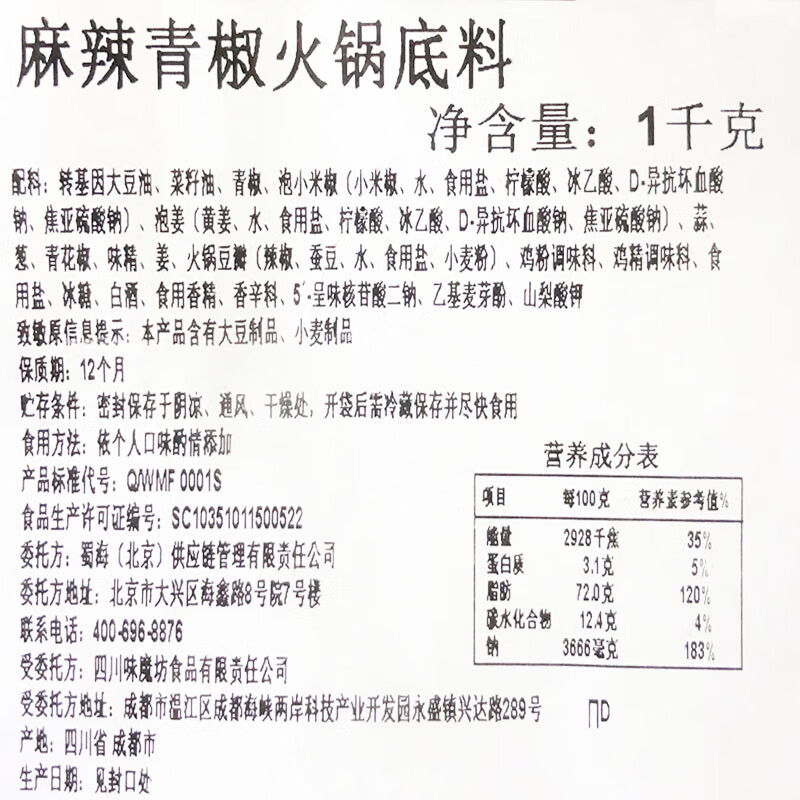 海底捞蜀海麻辣青椒火锅底料1kg整箱青椒鱼麻辣烫旋转小火锅冒菜 麻辣青椒1kg*1袋