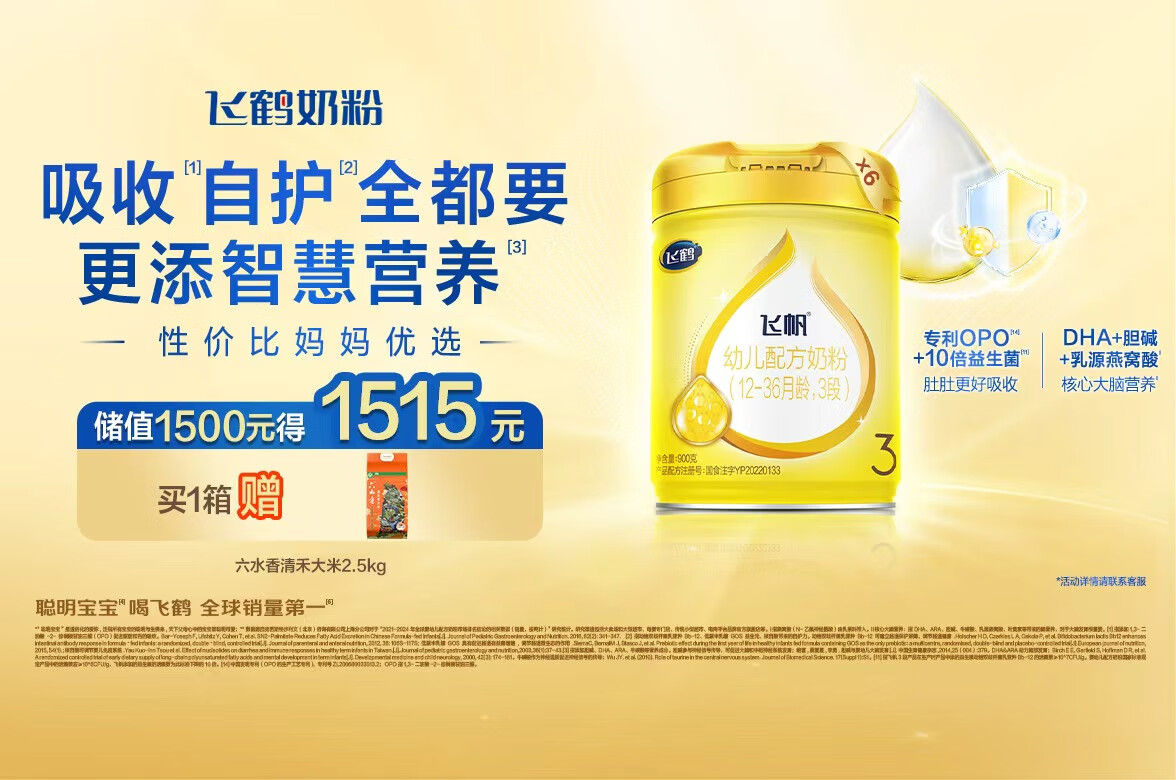 飞鹤飞帆OPO促吸收幼儿配方奶粉3段(12-36月龄)900g*6 DHA好脑力