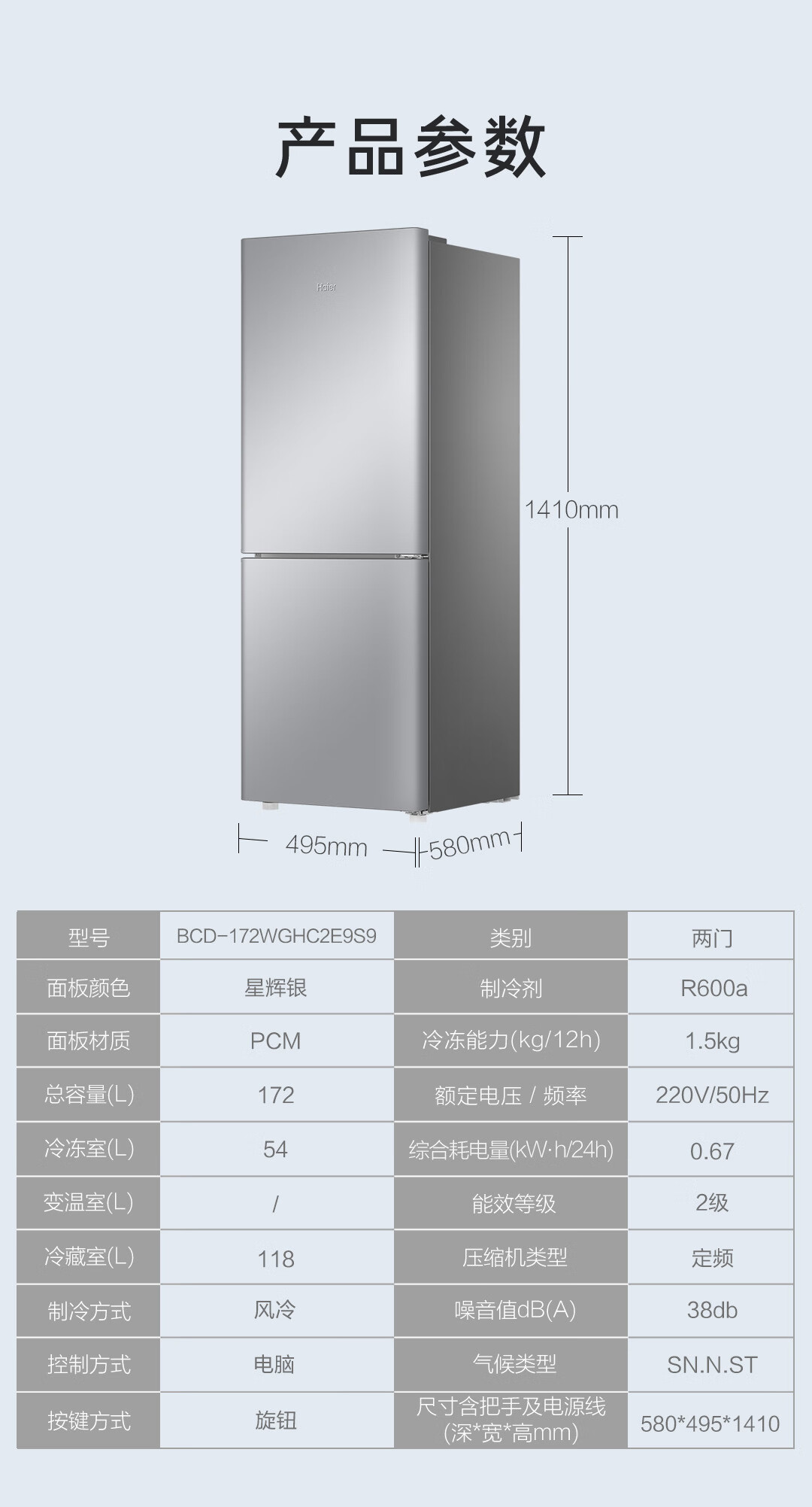 海尔(Haier)172升风冷无霜小冰箱冰箱双开门租房宿舍办公室家用冰箱小型节能BCD-172WGHC2E9S9补贴1