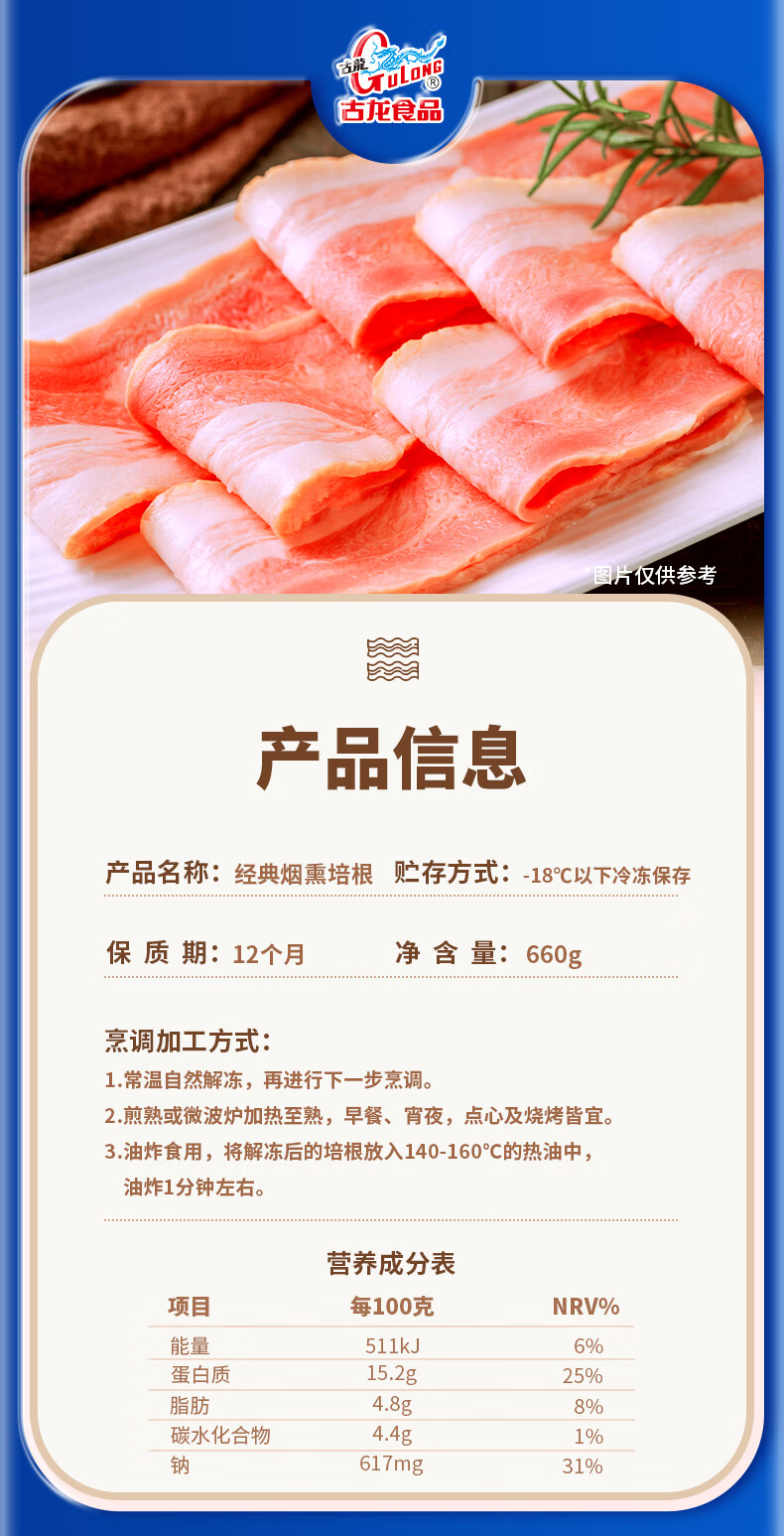 古龙经典烟熏培根220g*3 精选猪肉 早餐手抓饼三明治火锅烧烤西餐食材