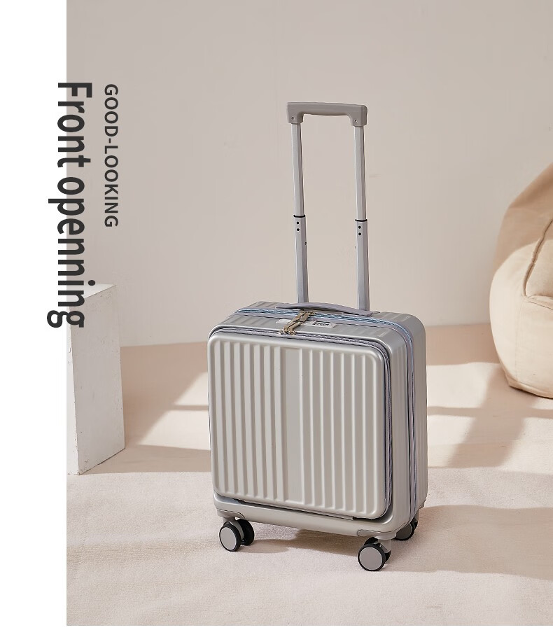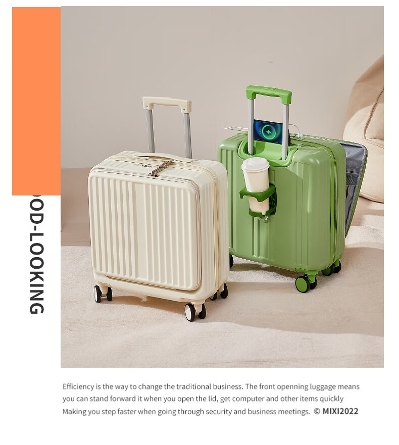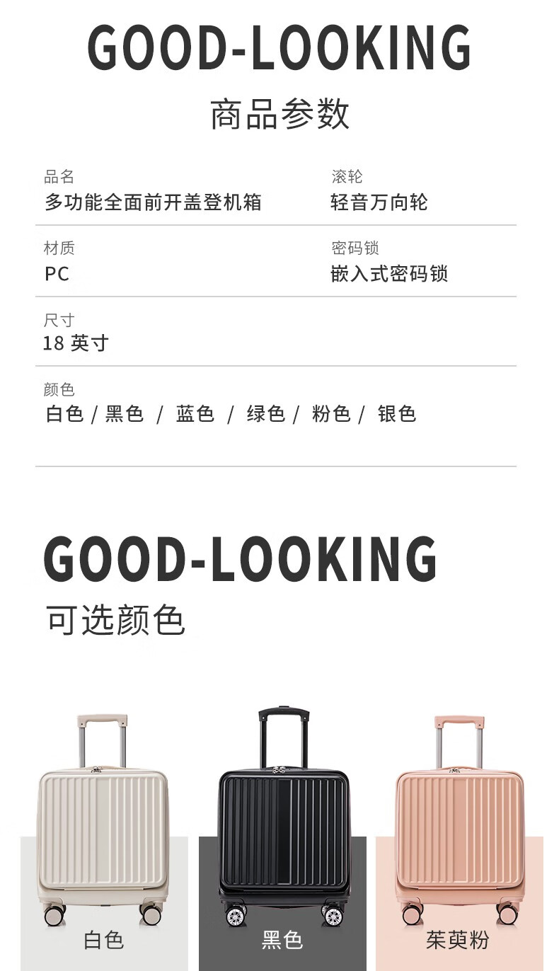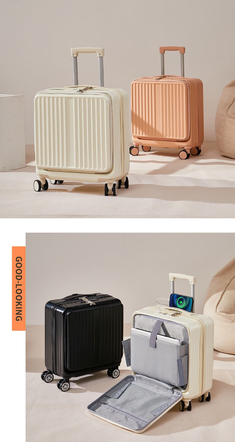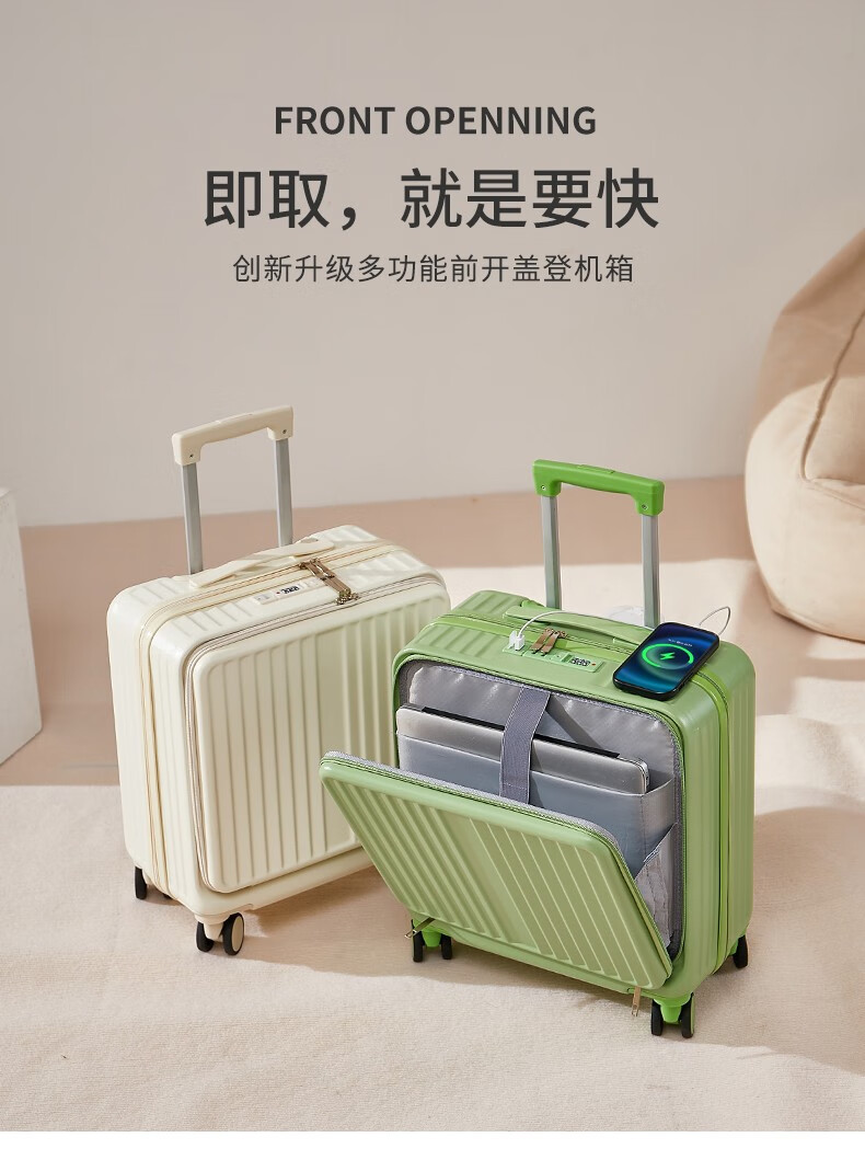 广璐迪前开盖小行李箱拉杆箱可上飞机登机箱18密码旅行箱子皮箱结实耐用 米白色 【USB/Type-c 双充电口】 18英寸 登机箱+干湿分离+杯架
