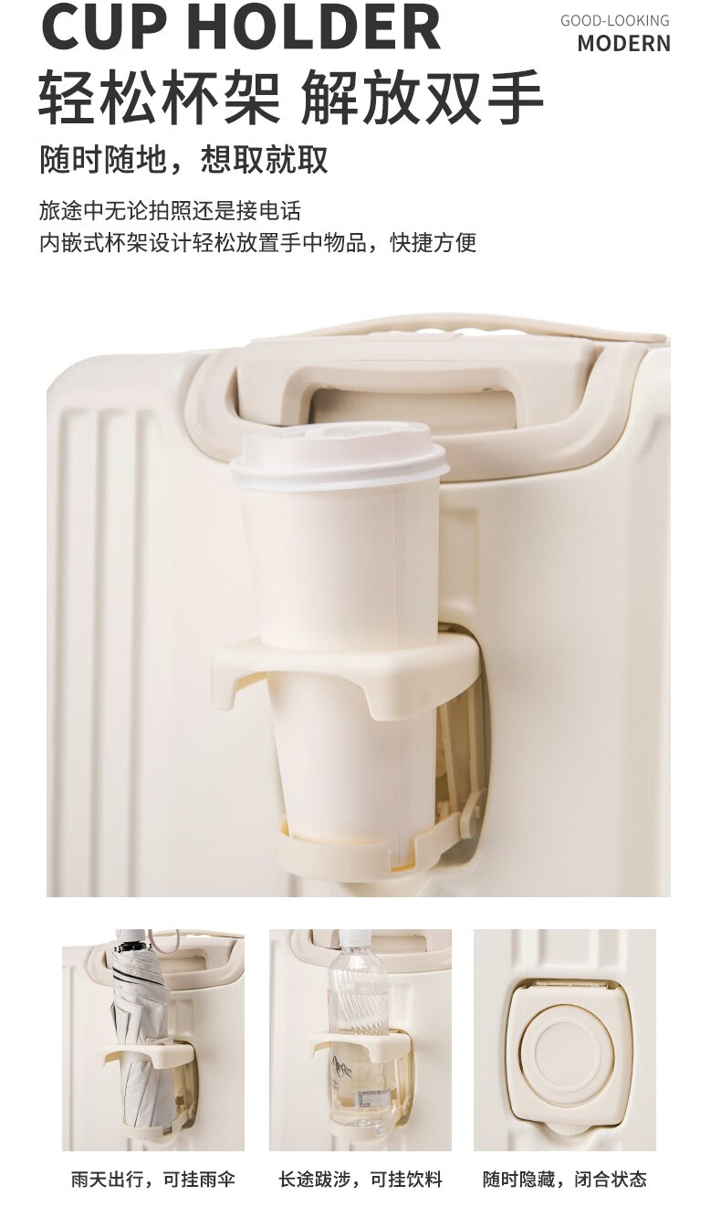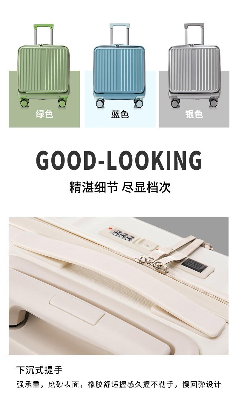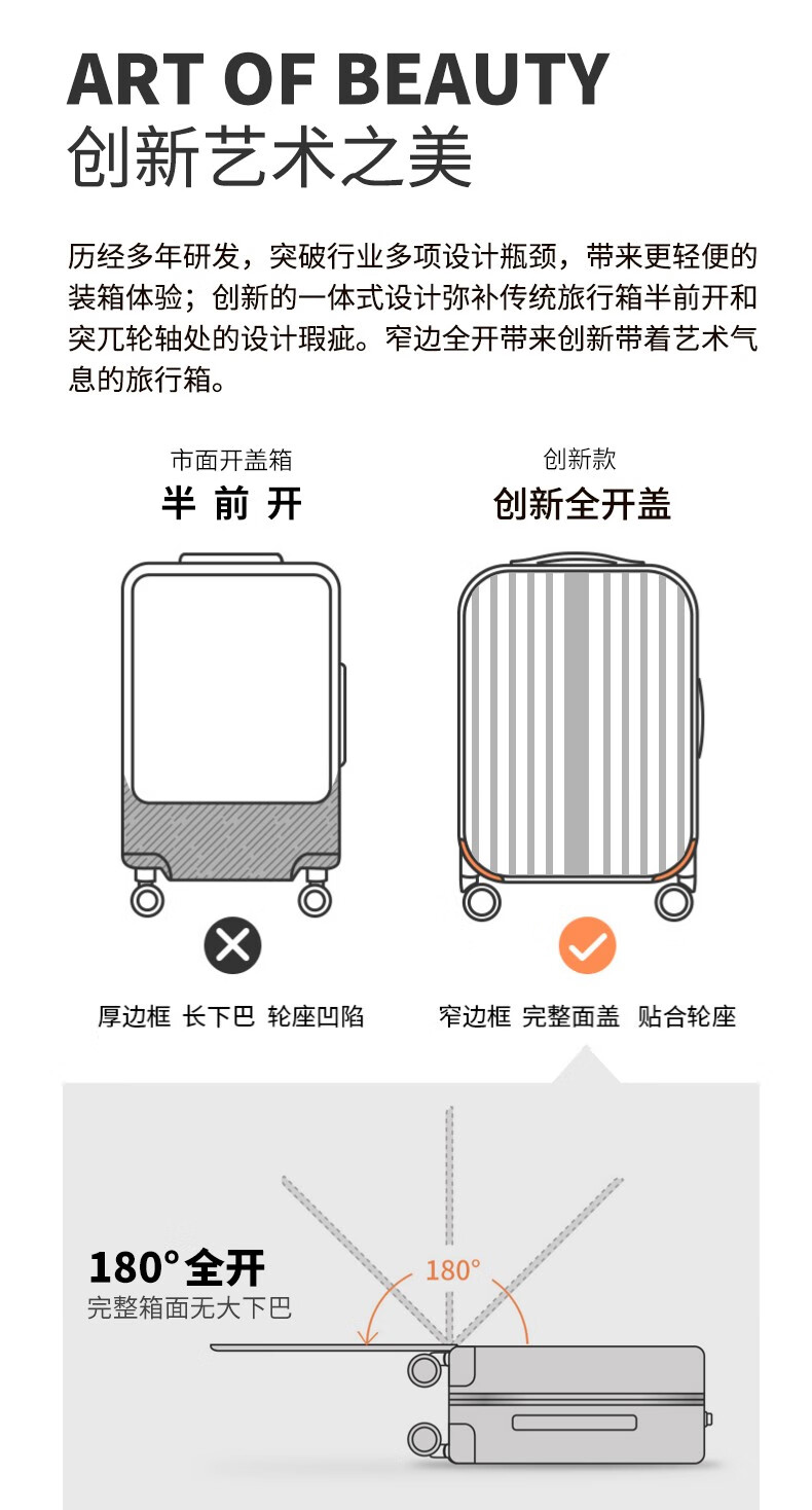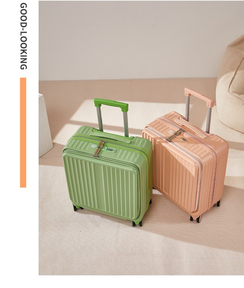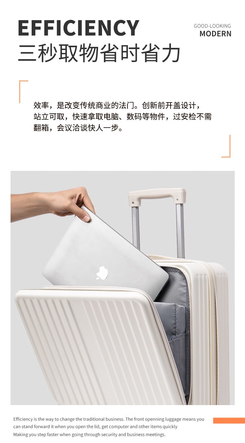 广璐迪前开盖小行李箱拉杆箱可上飞机登机箱18密码旅行箱子皮箱结实耐用 米白色 【USB/Type-c 双充电口】 18英寸 登机箱+干湿分离+杯架