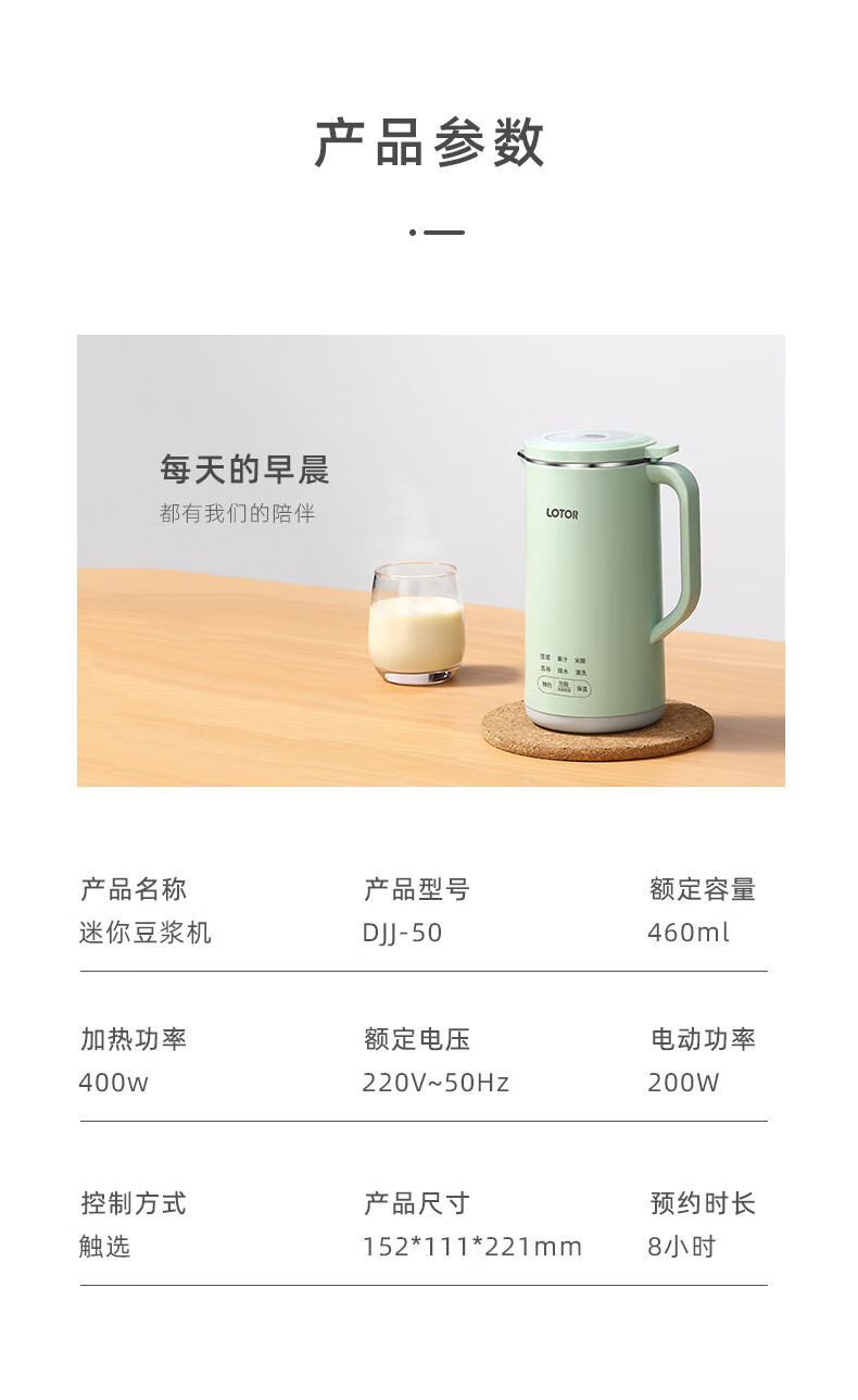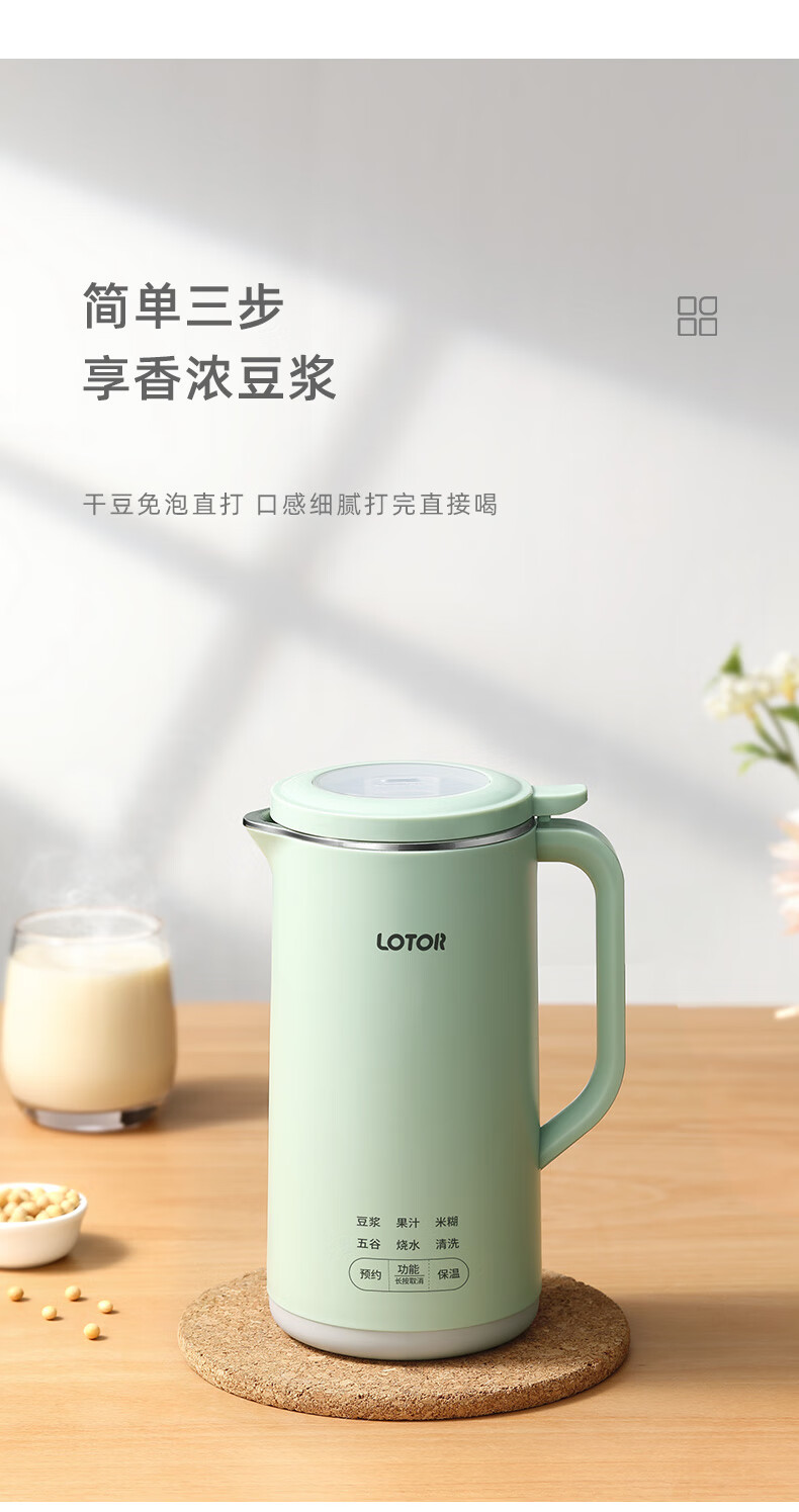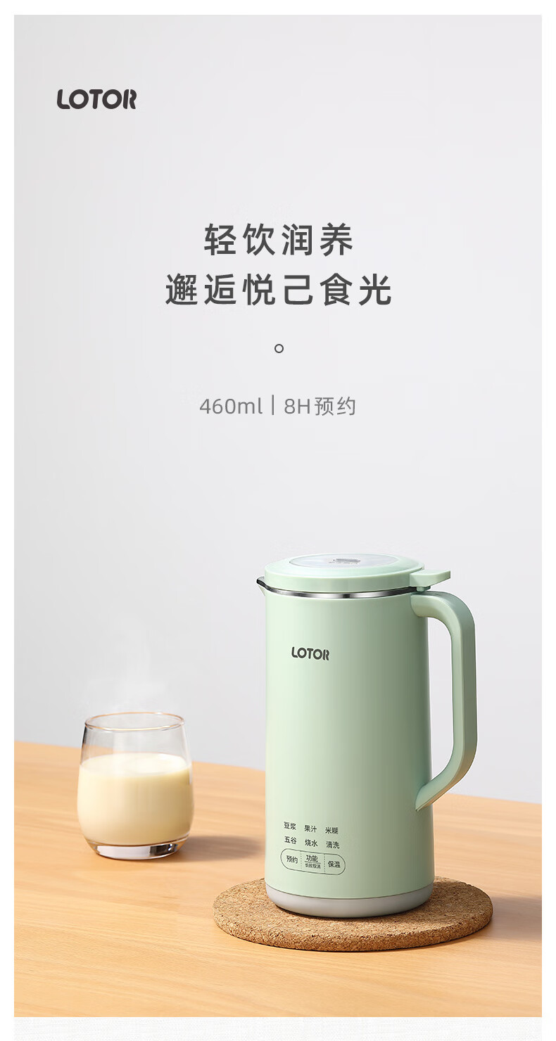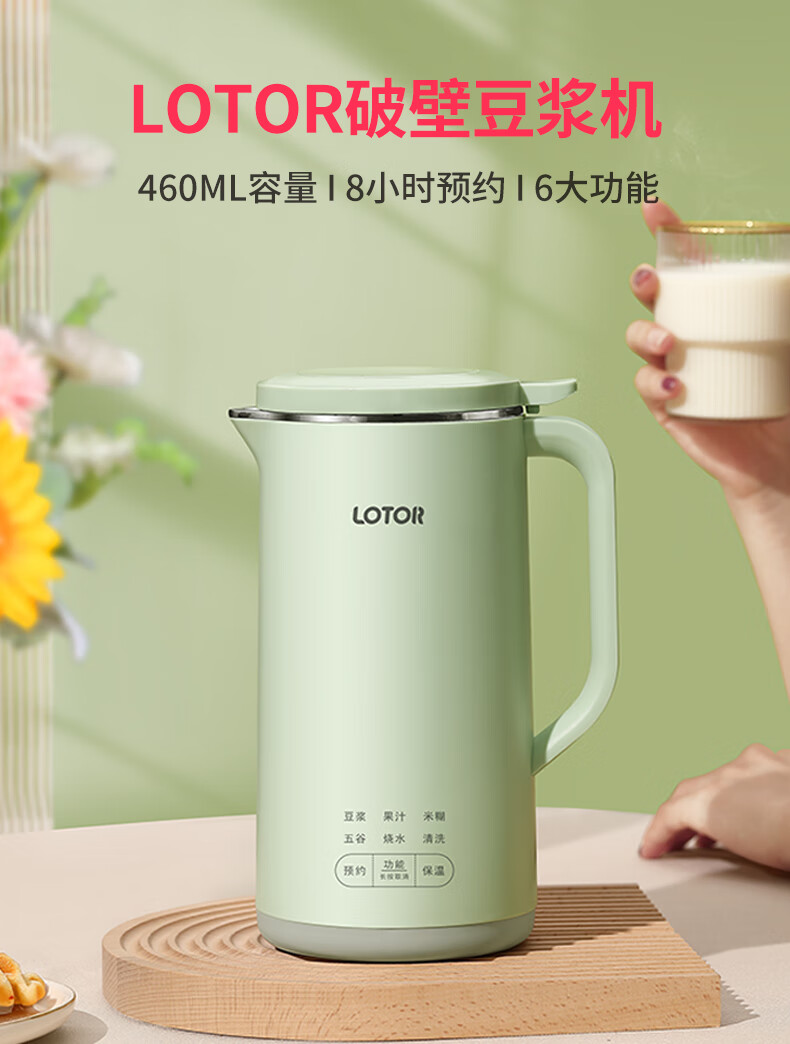 LOTOR迷你豆浆机家用小型破壁机五谷杂粮全自动免过滤1-2人食3米糊榨汁机 绿色 0.46L 标准款